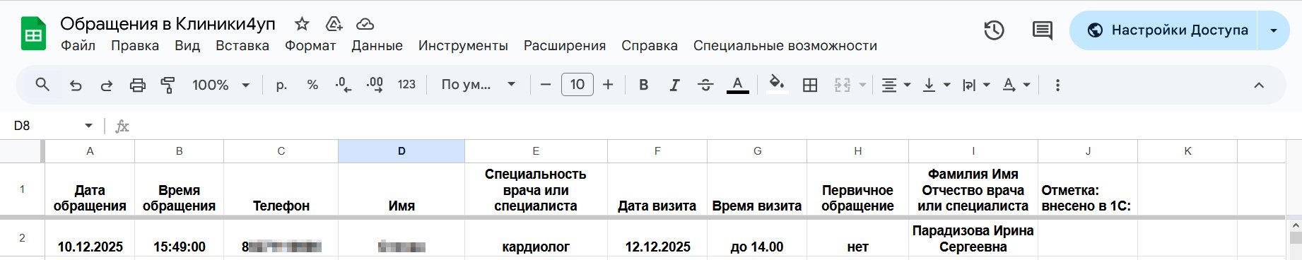 Google-таблица Обращений — это лайв-дашборд: сколько заявок, сколько и каких врачей, желаемое время визитов. Контроль и аналитика.