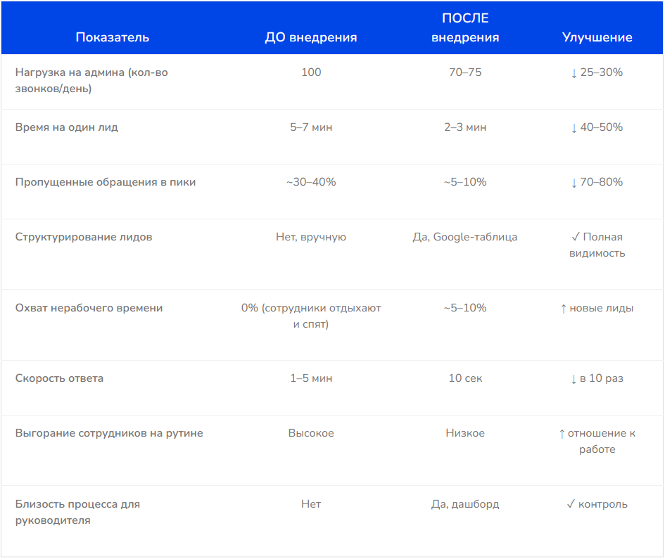 Нет стресса от пропущенных звонков, нет хаоса. Google-таблица запоминает все обращения. Уменьшается выгорание и текучесть персонала.