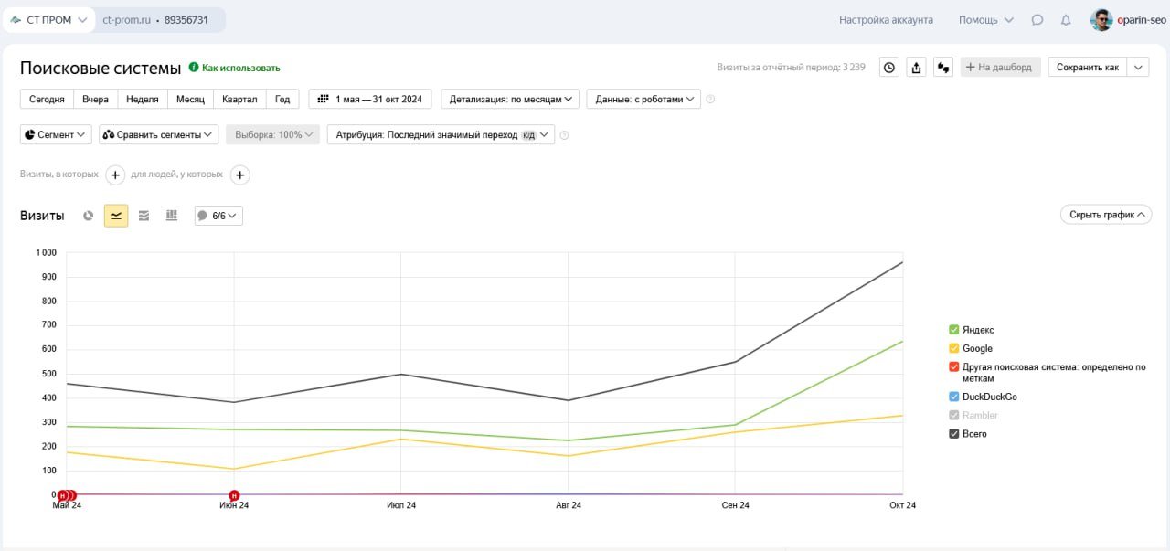 После внедрения всех описанных выше оптимизационных изменений мы приступили к регулярному мониторингу позиций сайта ct-prom.ru в поисковой выдаче и отслеживанию динамики роста органического трафика. И уже спустя первые несколько недель стали заметны впечатляющие результаты проделанной работы. 3.1 Рост органического трафика Первым и наиболее ярким показателем успешности SEO-кампании стал стремительный рост количества переходов из поисковых систем на сайт интернет-магазина. Для наглядности приведем сравнительные цифры органического трафика до и после оптимизации: - До начала работ (июнь 2024) - 438 переходов в месяц. - После 4 месяцев оптимизации (октябрь 2024) - 949 переходов в месяц. Таким образом, объем целевого трафика из поисковых систем вырос на впечатляющие 216% всего за 4 месяца проекта. Эти цифры наглядно демонстрируют, насколько эффективными были предпринятые нами меры по улучшению структуры сайта, расширению семантического ядра и оптимизации контента.