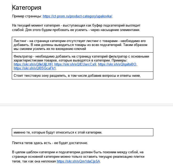 В ходе анализа структуры сайта ct-prom.ru мы обнаружили серьезную проблему: родительские категории, такие как "Полиэтиленовая пленка", "Укрывной материал", "Мешки для мусора" и другие, не содержали листингов товаров. На этих страницах был представлен только перечень подкатегорий без каких-либо продуктов.