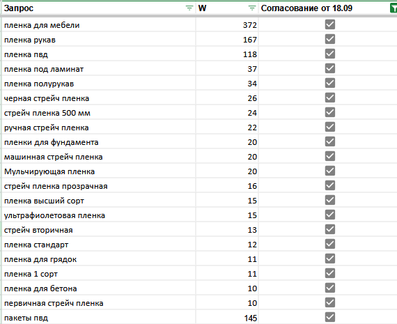 1. Сначала наши специалисты собрали наиболее полный список высокочастотных и среднечастотных поисковых запросов в тематике упаковочных материалов и хозтоваров.