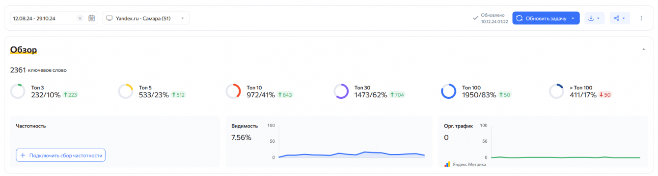 Помимо непосредственного роста органического трафика, мы также добились значительного улучшения видимости сайта в поисковой выдаче по ключевым запросам благодаря проведенной SEO-оптимизации. Сравнительная статистика позиций ct-prom.ru до и после кампании: До оптимизации (июнь 2024): - В Топ-5 выдачи: 21 ключевая фраза из 2361 - В Топ-10: 129 фраз из 2361 - В Топ-30: 769 фраз из 2361 После 4 месяцев оптимизации (октябрь 2024): - В Топ-5 выдачи: 533 ключевые фразы из 2361 (+512) - В Топ-10: 972 фразы из 2361 (+843) - В Топ-30: 1473 фразы из 2361 (+704) График роста числа ключевых фраз в Топ-10: