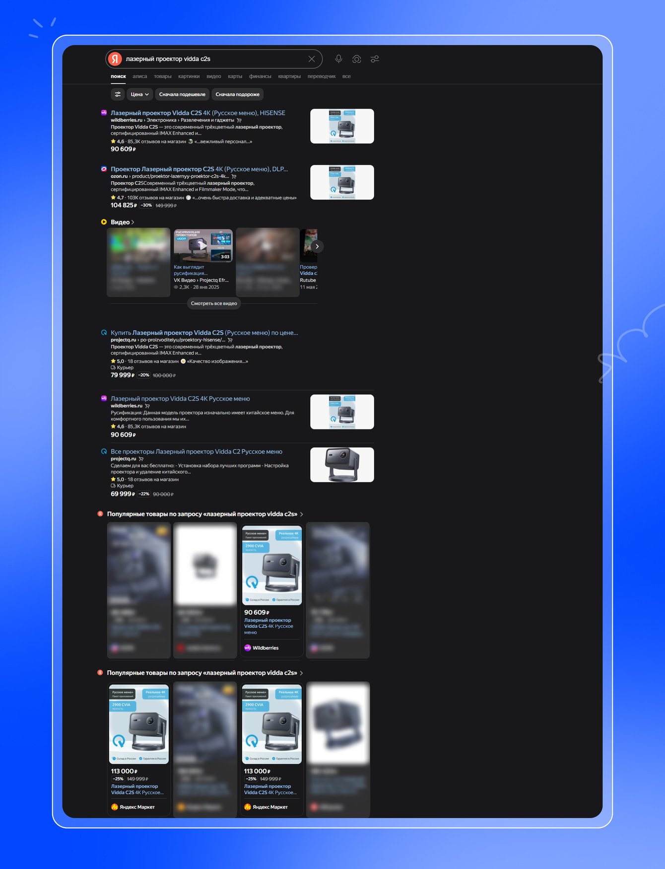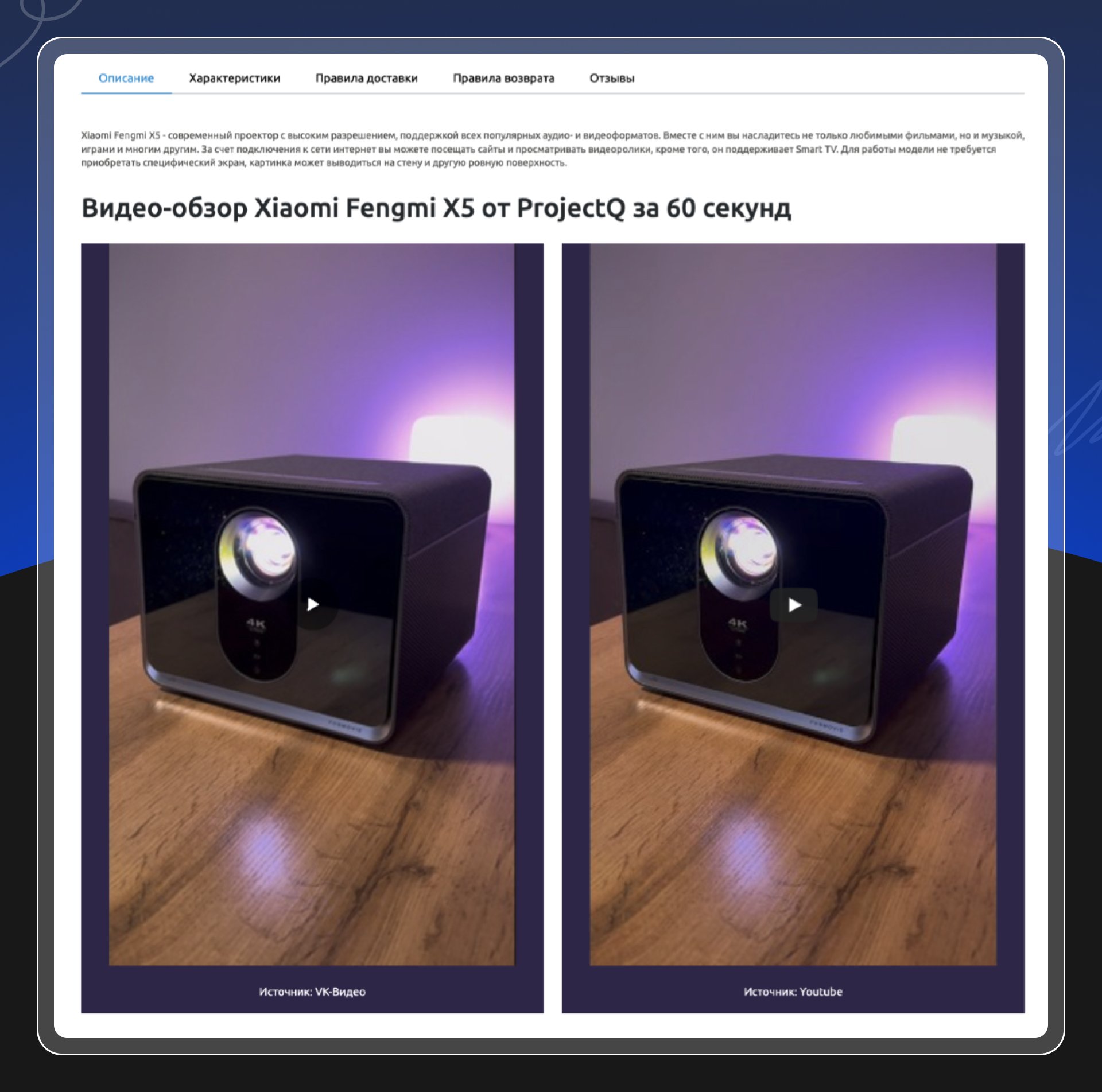 На YouTube и в соцсетях мы публиковали обзоры и разборы моделей проекторов, которые затем встраивали в материалы сайта. Такие видео не только помогают пользователям быстрее разобраться в технике, они стали дополнительным источником информации для поисковых систем. И позже именно эти страницы начали стабильно ранжироваться по информационным запросам. А когда пользователи стали задавать те же вопросы нейросетям, AI-системы начали забирать ответы уже из подготовленного контентного слоя сайта.