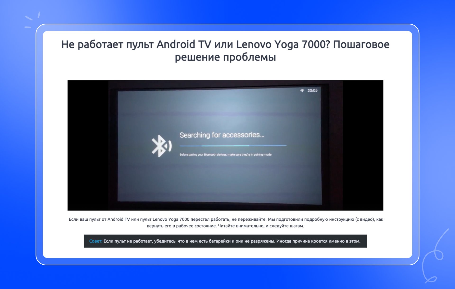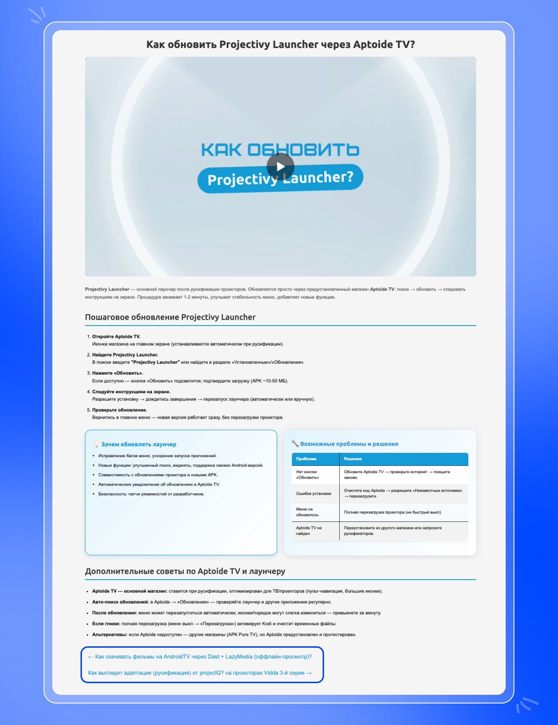 Источник информации – реальные обращения клиентов. Мы фиксировали повторяющиеся вопросы и превращали их в отдельные страницы с ответами. Важно, что мы не стали складывать все ответы в одно место. Часть вопросов требовала короткого и быстрого ответа – например, как обновить проектор или где включается нужная настройка. Такие вещи пользователь хочет увидеть сразу, без переходов и длинного чтения. Их мы вынесли в раздел FAQ.
