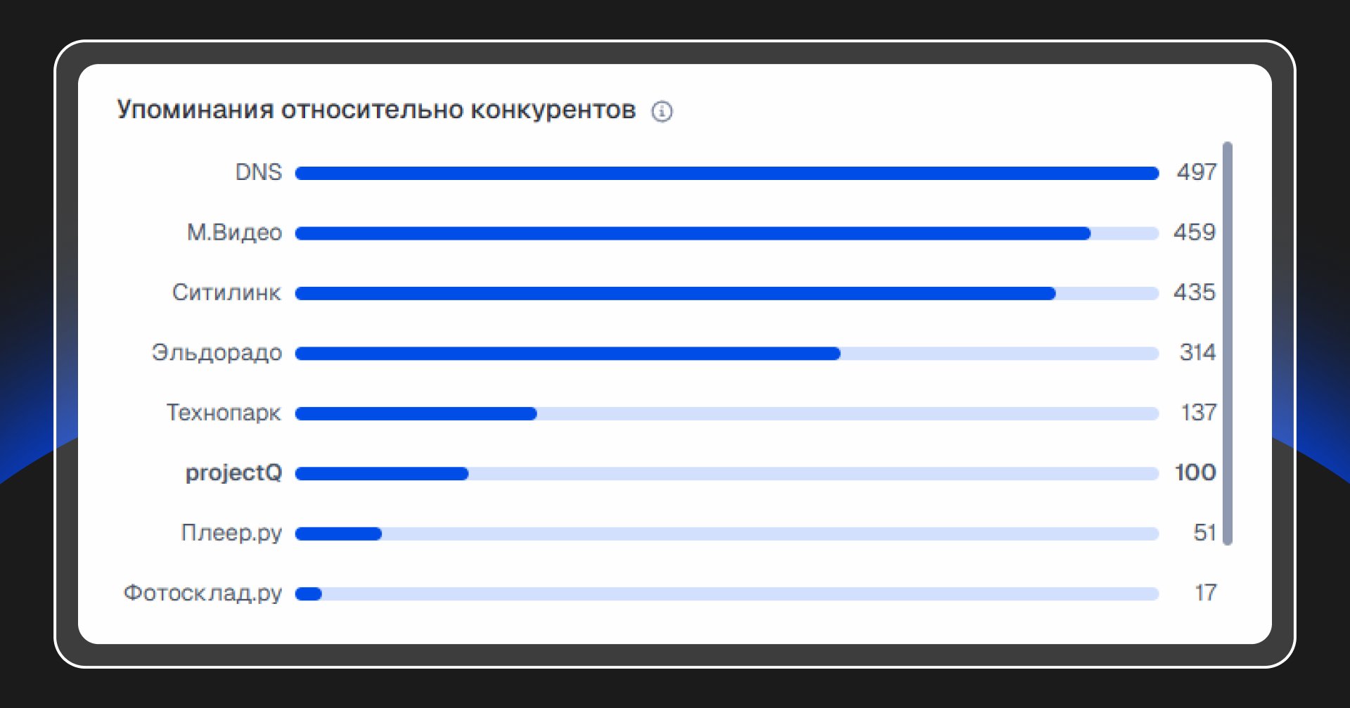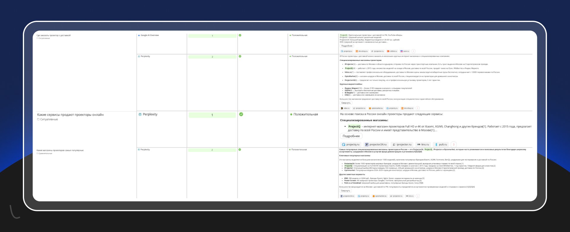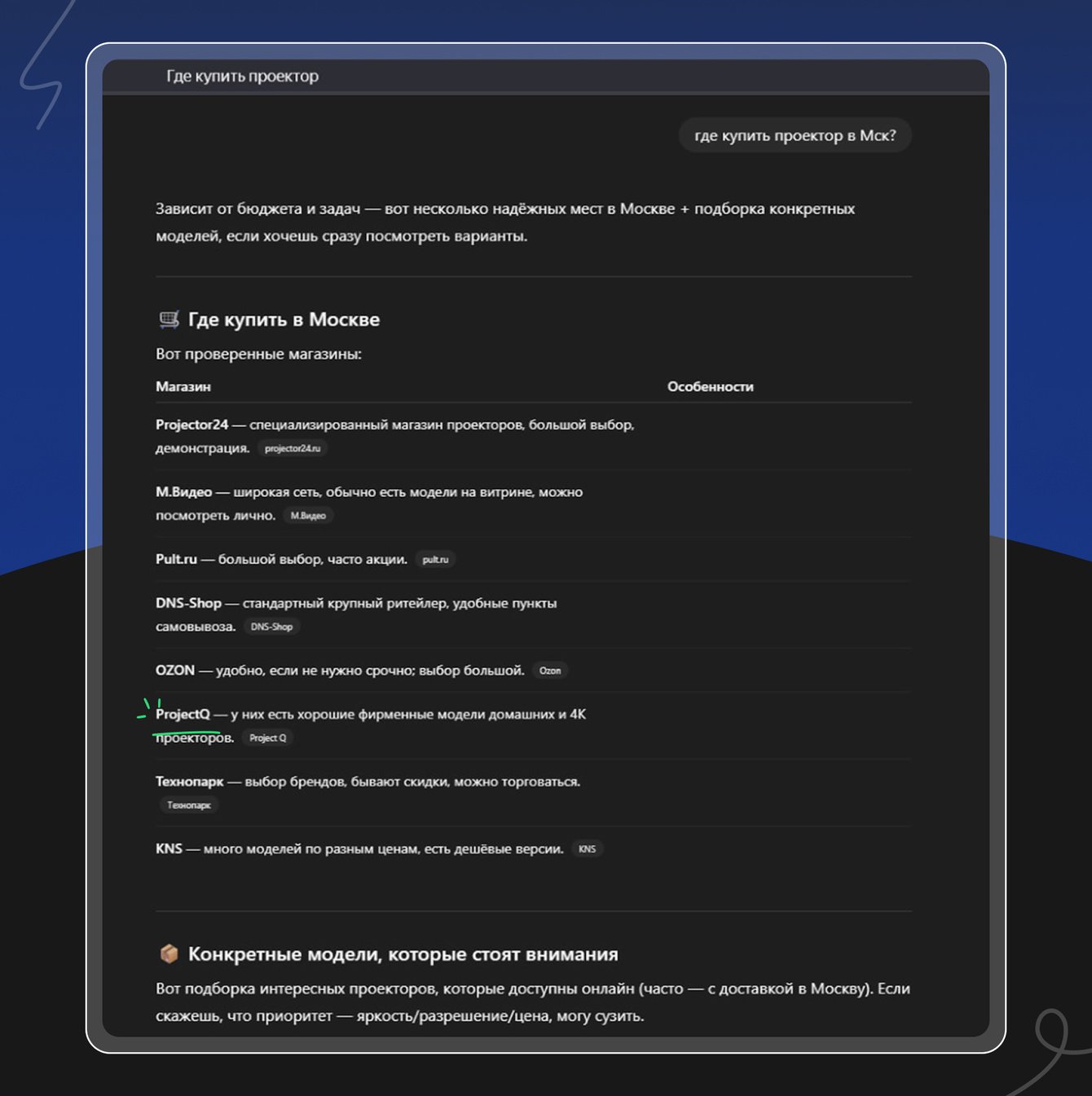 Даже при сравнении с крупными ритейлерами и специализированными магазинами бренд ProjectQ регулярно появляется в AI-ответах. Это важно: нейросети не выбирают источники только по размеру компании. Для них гораздо важнее, чтобы сайт давал подробные, понятные и структурированные ответы на реальные вопросы пользователей.