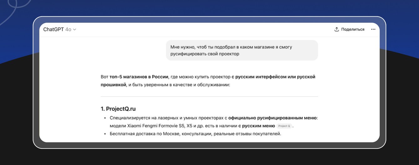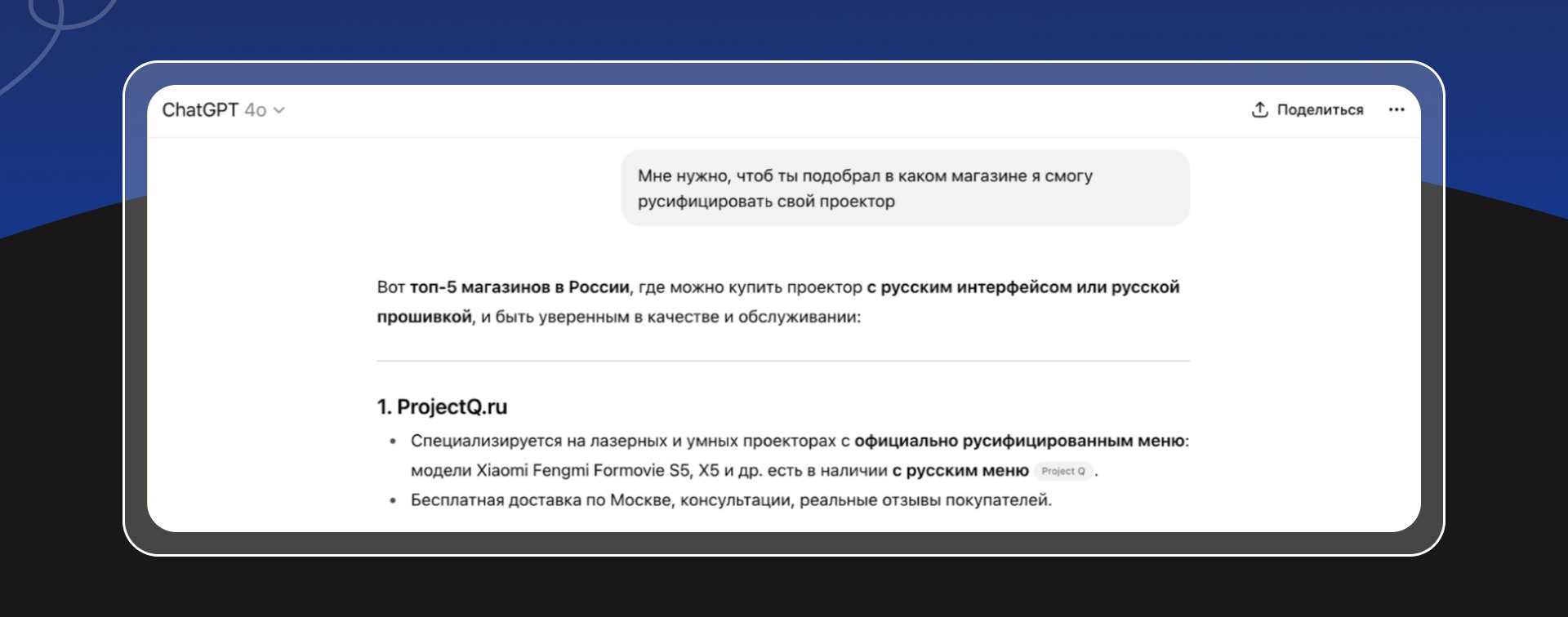 А в июне 2025 года мы зафиксировали первые продажи через ChatGPT. Покупатели называли именно ответ нейросети первой точкой касания с брендом ProjectQ. Пользователи задавали ChatGPT вопрос о русификации проектора, получали ссылку на поддомен ProjectQ, переходили в мессенджер на сайте и заказывали услугу. Мы специально проверили это: оказалось, что ссылки действительно выдаются нейросетью.