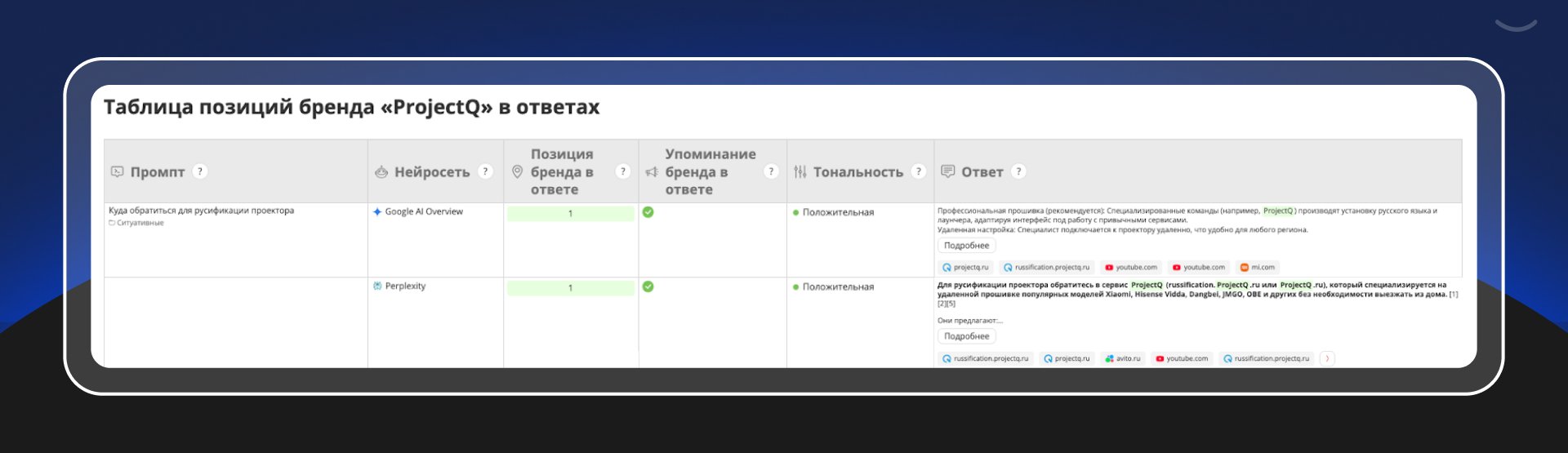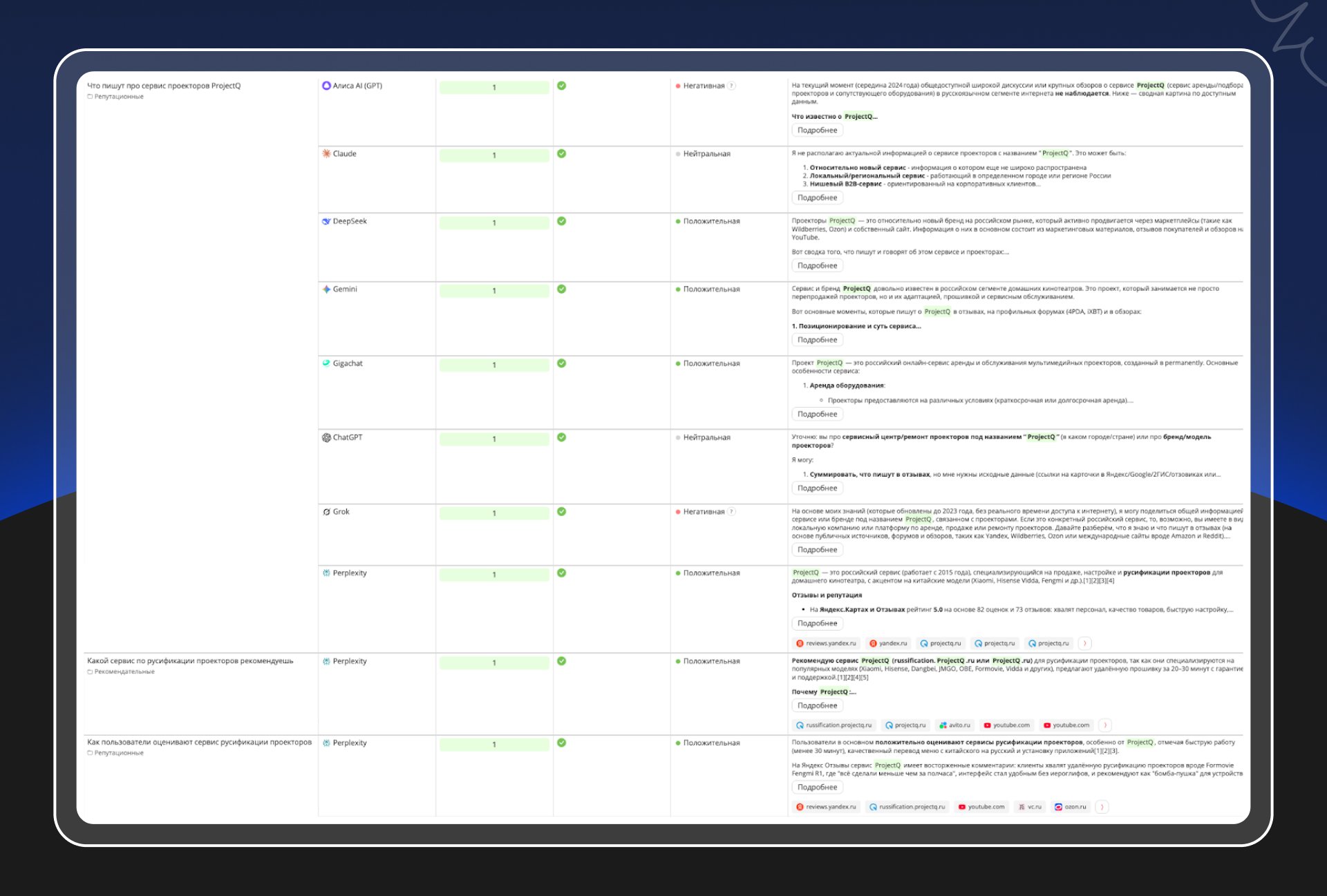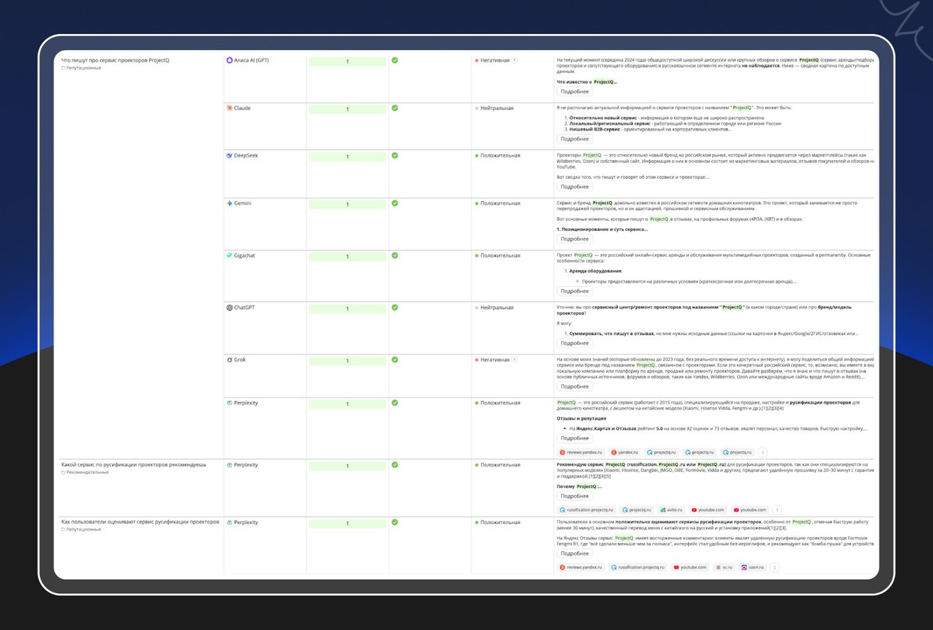 • оценить видимость ProjectQ в нейросетях через специальные сервисы по тематическим и товарным запросам