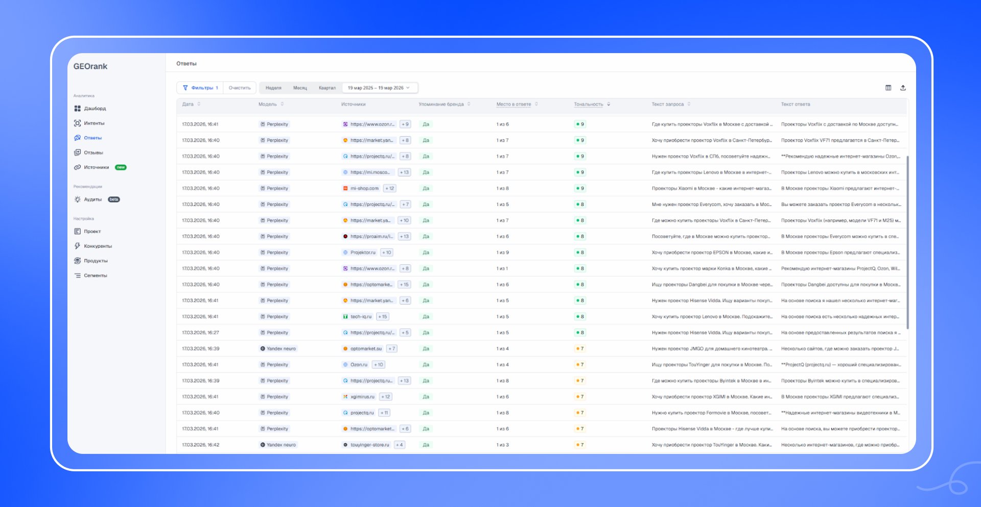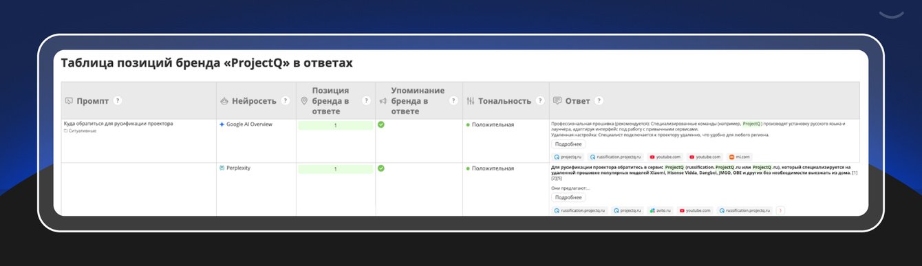 Именно поэтому в кейсе мы смотрим не только на клики из AI, но и на более широкую картину: упоминания бренда в нейроответах, позиции в ответах разных систем и реальное появление ProjectQ в ответах на пользовательские запросы.