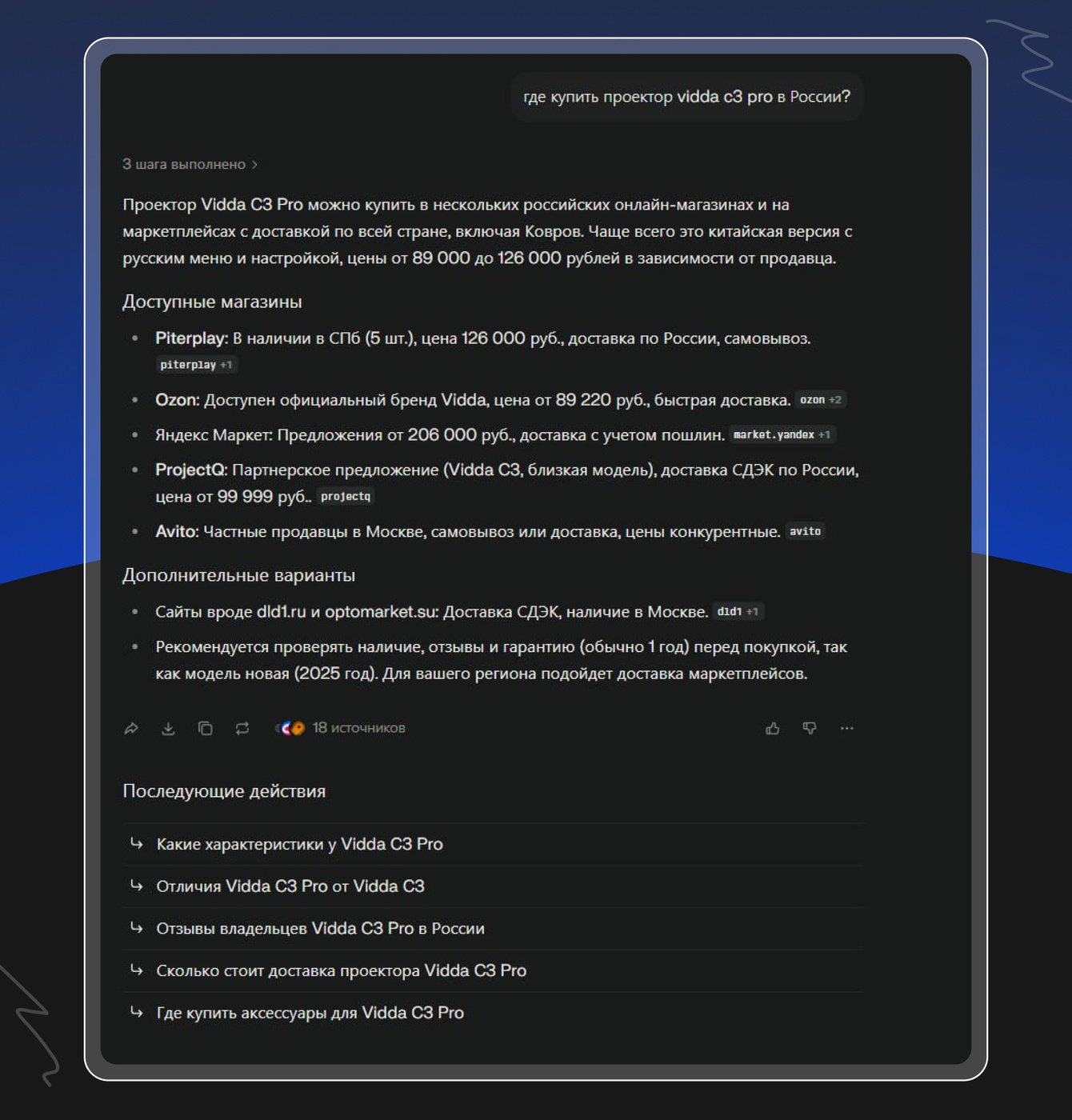 Проект, стартовавший с 20 заказов в месяц, теперь фигурирует в ответах ChatGPT рядом с торговыми гигантами – M.Video, Ozon, DNS. Тогда мы осознали: поисковое поведение меняется и нейросети уже сегодня влияют на пользовательские решения.