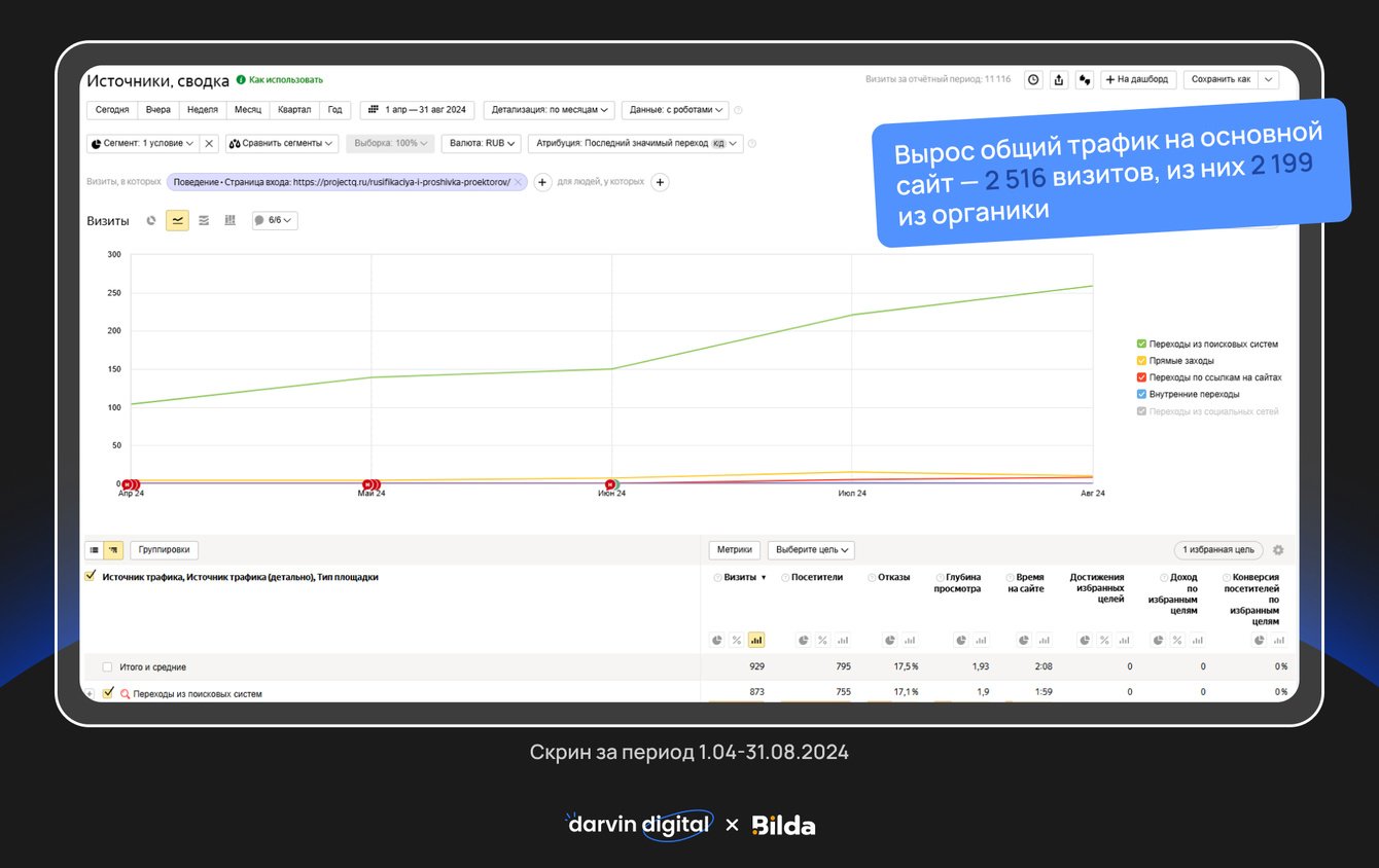 За тот период страница русификации на основном сайте собрала более двух с половиной тысяч визитов из поиска, а поддомен – более трёх тысяч. Теперь пользователи приходили не только за проектором, но и за услугой прошивки. Такой связный подход «сайт + поддомен» усилил SEO обоих ресурсов.
