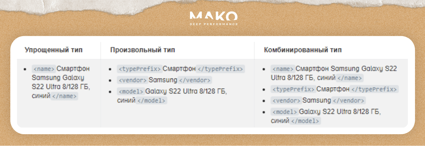 1) Упрощенный. Характеристики товара можно прописать только в одном элементе ― заголовке . Важно подобрать самые релевантные запросы, чтобы товар увидели пользователи, которые ищут именно его.