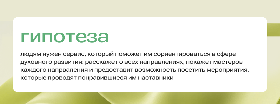 Работу начали с гипотез. По первой — пользователям нужен удобный инструмент, который поможет разбираться в направлениях, фильтровать практики и находить наставников, вызывающих доверие. Вторая гипотеза касалась наставников: они тоже могут быть заинтересованы в платформе, если она поможет им решать маркетинговые задачи и приведёт стабильный поток клиентов.