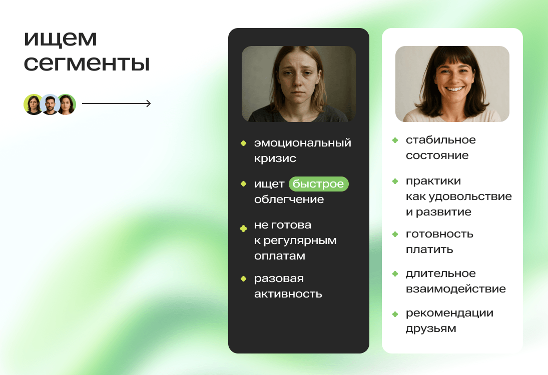 Всего мы провели 15 глубинных интервью. Уже первые беседы позволили очертить границы сегментов. Одна из первых респонденток находилась в тяжелом эмоциональном состоянии и искала поддержку в быстром доступе к практикам. Это был не совсем наш сегмент: в состоянии кризиса люди ищут не долгосрочные платные форматы, а способ облегчить душевную боль в моменте.