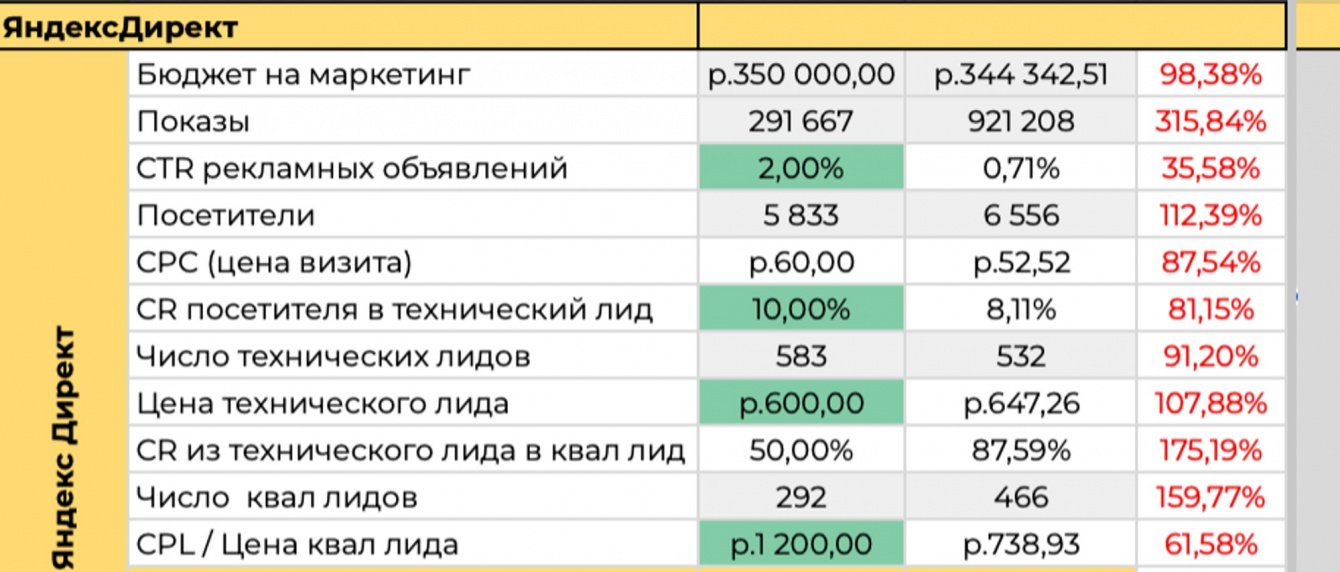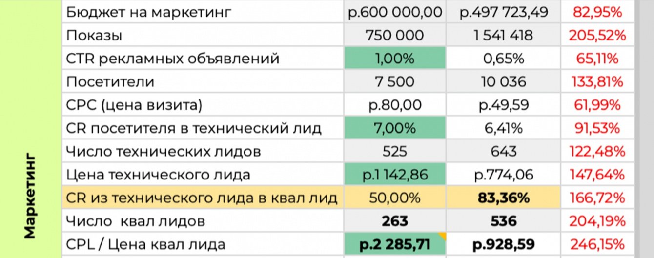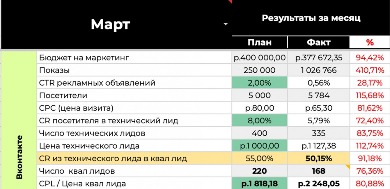 По данным стратегиям мы за 1-й месяц работы смогли получить: 168 квал. лидов (112% выполнение плана) по 2248 руб. (88% выполнение плана)