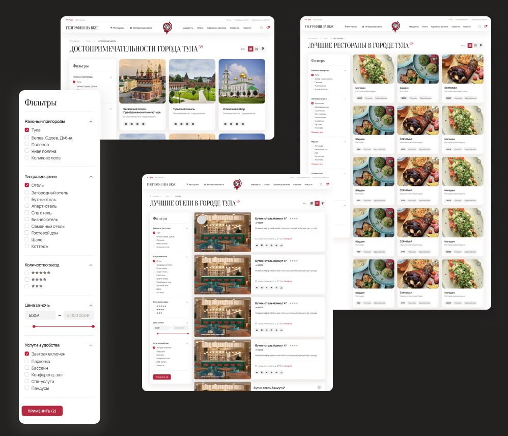 После изучения аудитории и конкурентов мы поняли, что хороший путеводитель отвечает на 3 самых больных вопроса: «Что посмотреть?», «Что поесть?» и «Где поспать?». Из этого мы нашли 3 ключевые раздела сайта: достопримечательности, рестораны и отели.