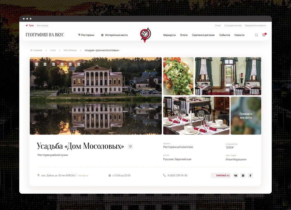 Оформили компактную, но при этом информативную карточку для каждого раздела сайта. На ней мы показываем несколько крупных фотографий и всю ключевую информацию: какая кухня, какой чек, где находится и как работает.