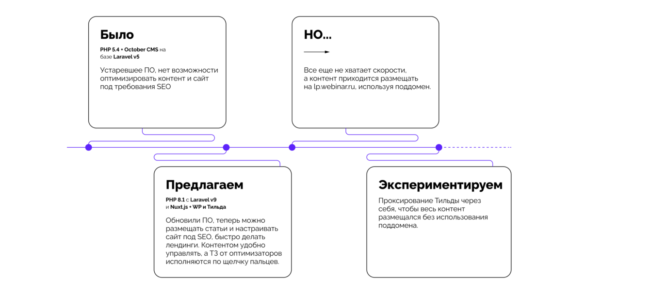 В чем была сложность? Сайт заказчика был разработан в связке PHP 5.4 + October CMS на базе Laravel v5. Фактически, речь шла об устаревшей версии ПО и отсутствии нужной для оптимизаторов функциональности. Нам пришлось обновить стек до PHP 8.1 с Laravel v9 и Nuxt.js, заново написать код и оптимизировать структуру. А еще: подключить Wordpress для хорошей SEO-оптимизации и Тильду, для запланированных массовых лендингов под гипотезы и сбор лидов.