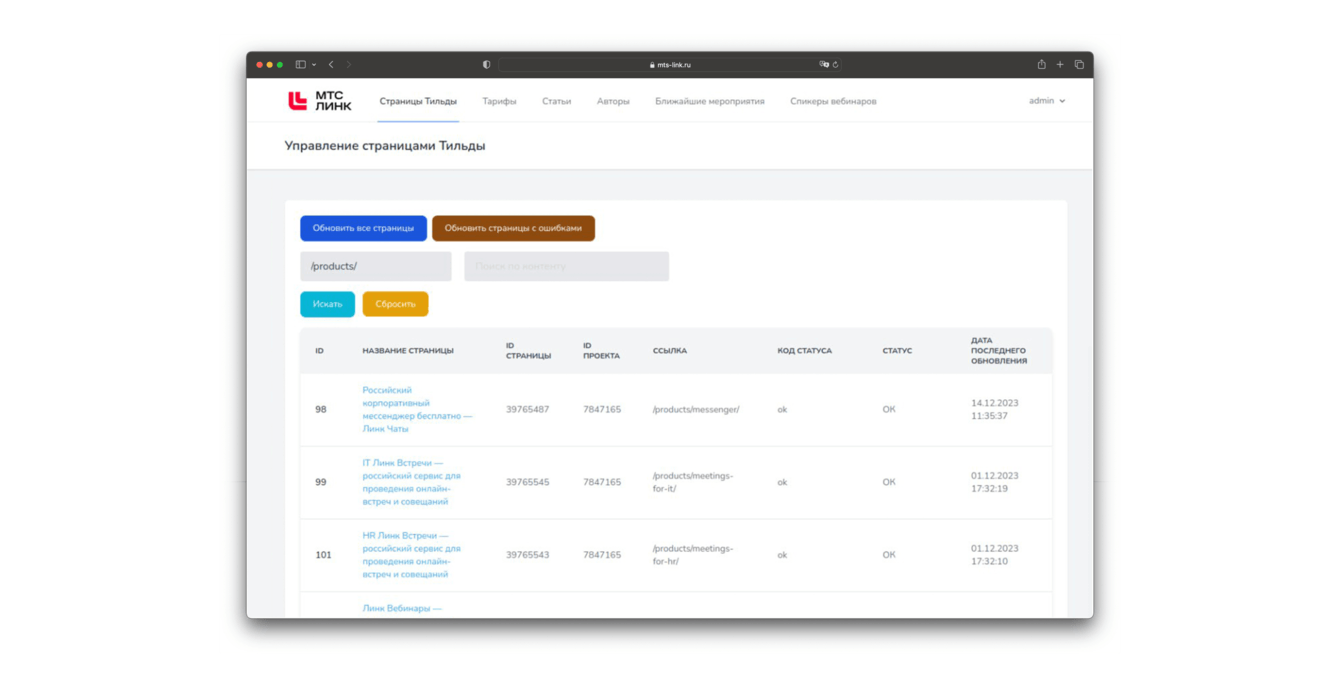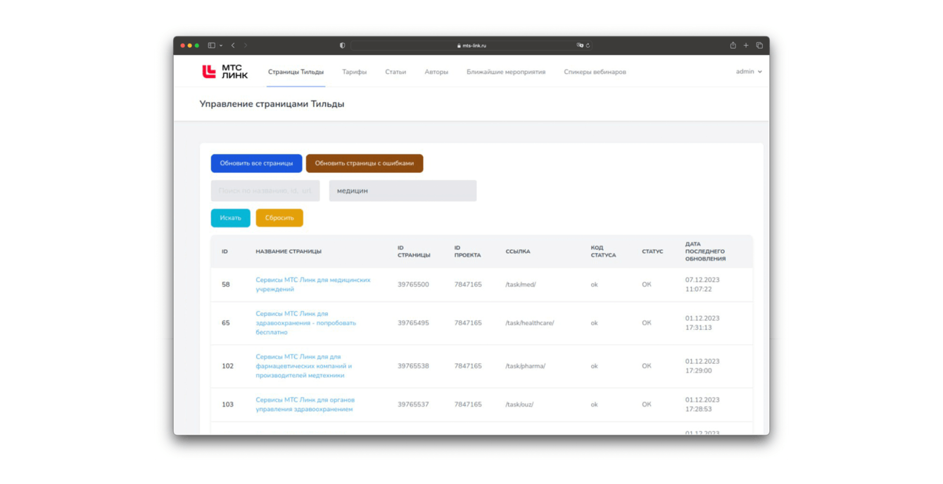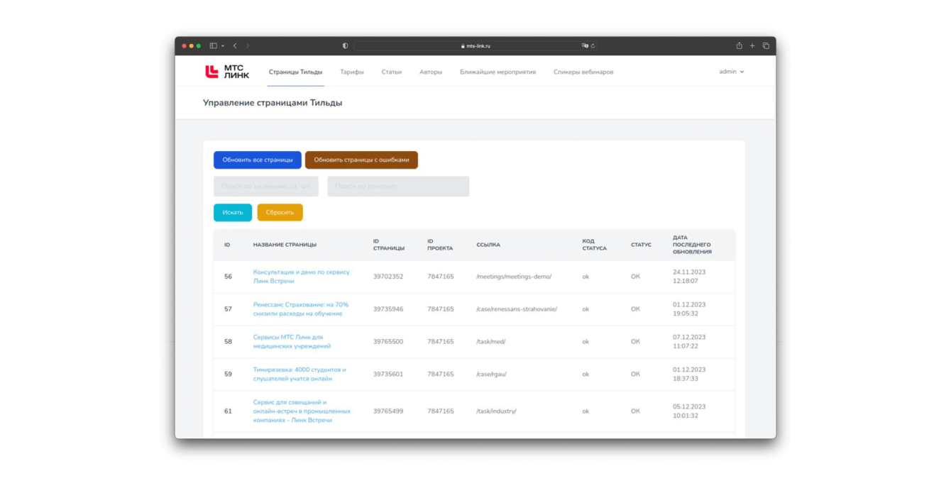 4. Нужен был человеческий поиск. Например, маркетологу требовалось заменить какое-либо слово на всех лендингах Тильды, но найти его вхождения через админку было невозможно, пришлось бы методично открывать каждую страницу. Полноценный поиск по документам и адресам в импровизированной админке гарантировал «Логеме» плюс в карму.