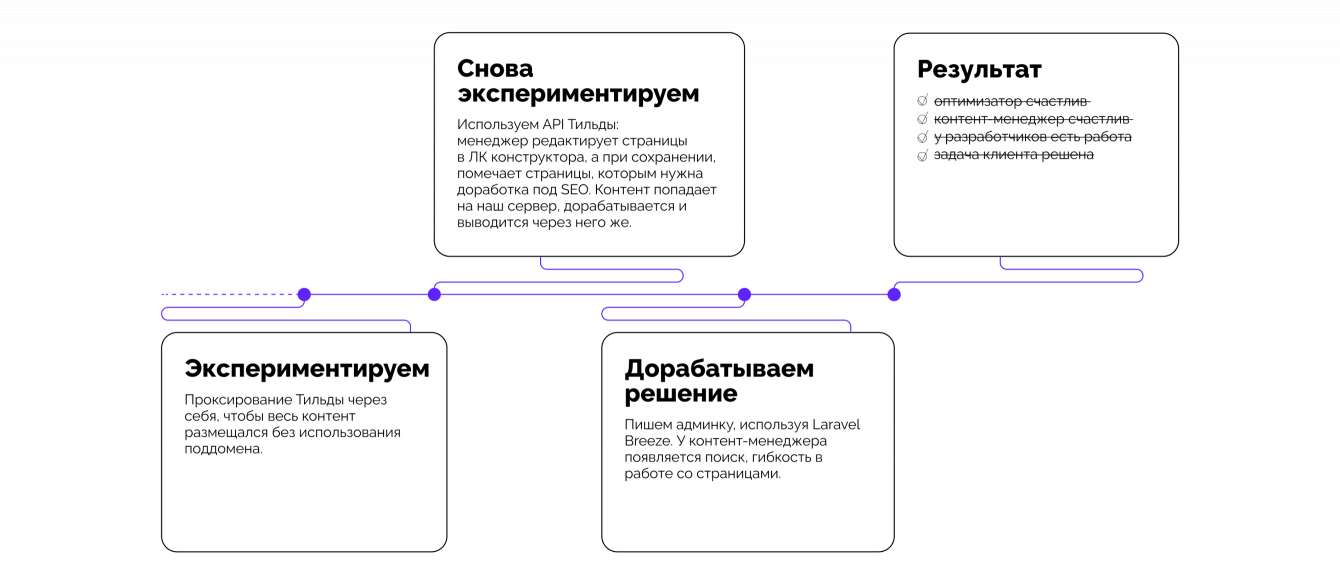Сначала мы предложили проксирование. Казалось бы, контент-менеджеры и маркетологи заказчика теперь могли спокойно решать, какой из 400 лендингов на Тильде требует внимания — гипотеза выстрелила, трафик можно приводить не только через контекст или таргет, но и с органики. Нужна доработка страницы? Проксируем страницу на сервер с помощью nginx → посетитель даже не замечает перехода между нашей версией страницы и Тильдой, но…