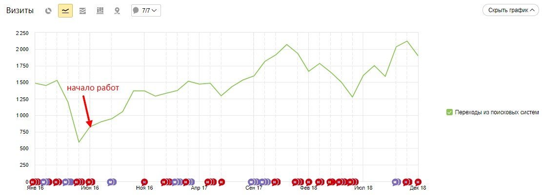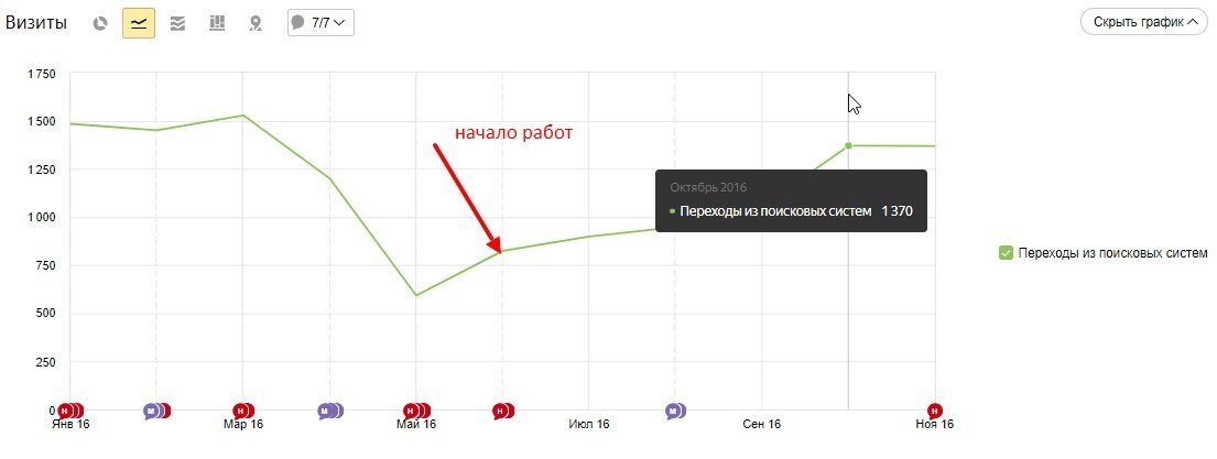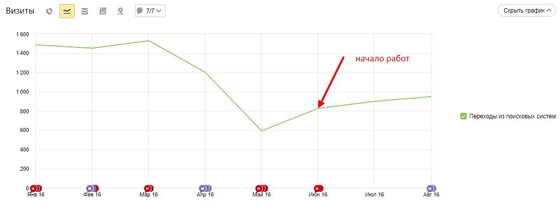 На старте работ поисковый трафик был на уровне 700-800 визитов в месяц