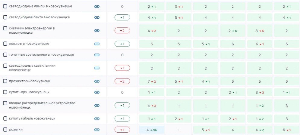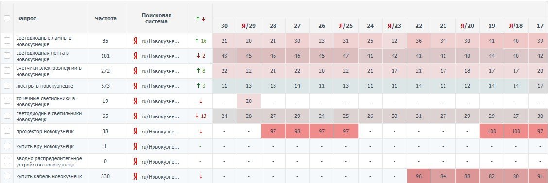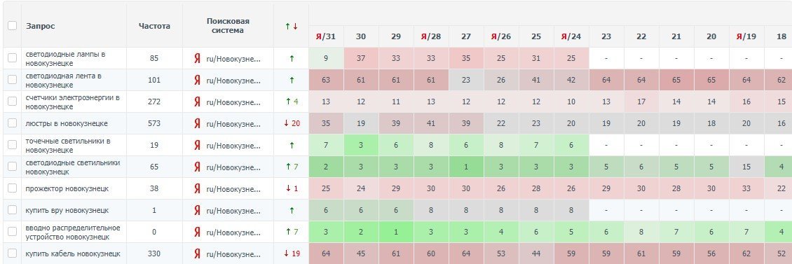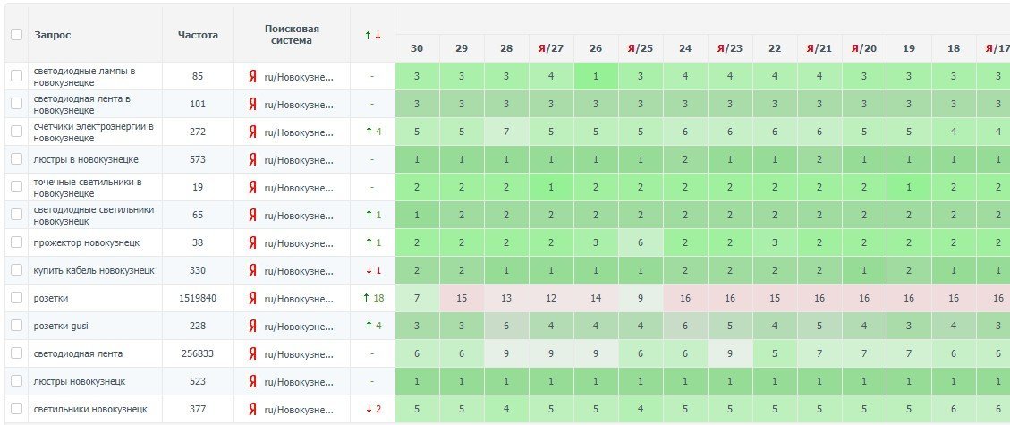Для начала мы совместно с клиентом определили ключевые запросы, по которым будем отслеживать динамику позиций сайта.