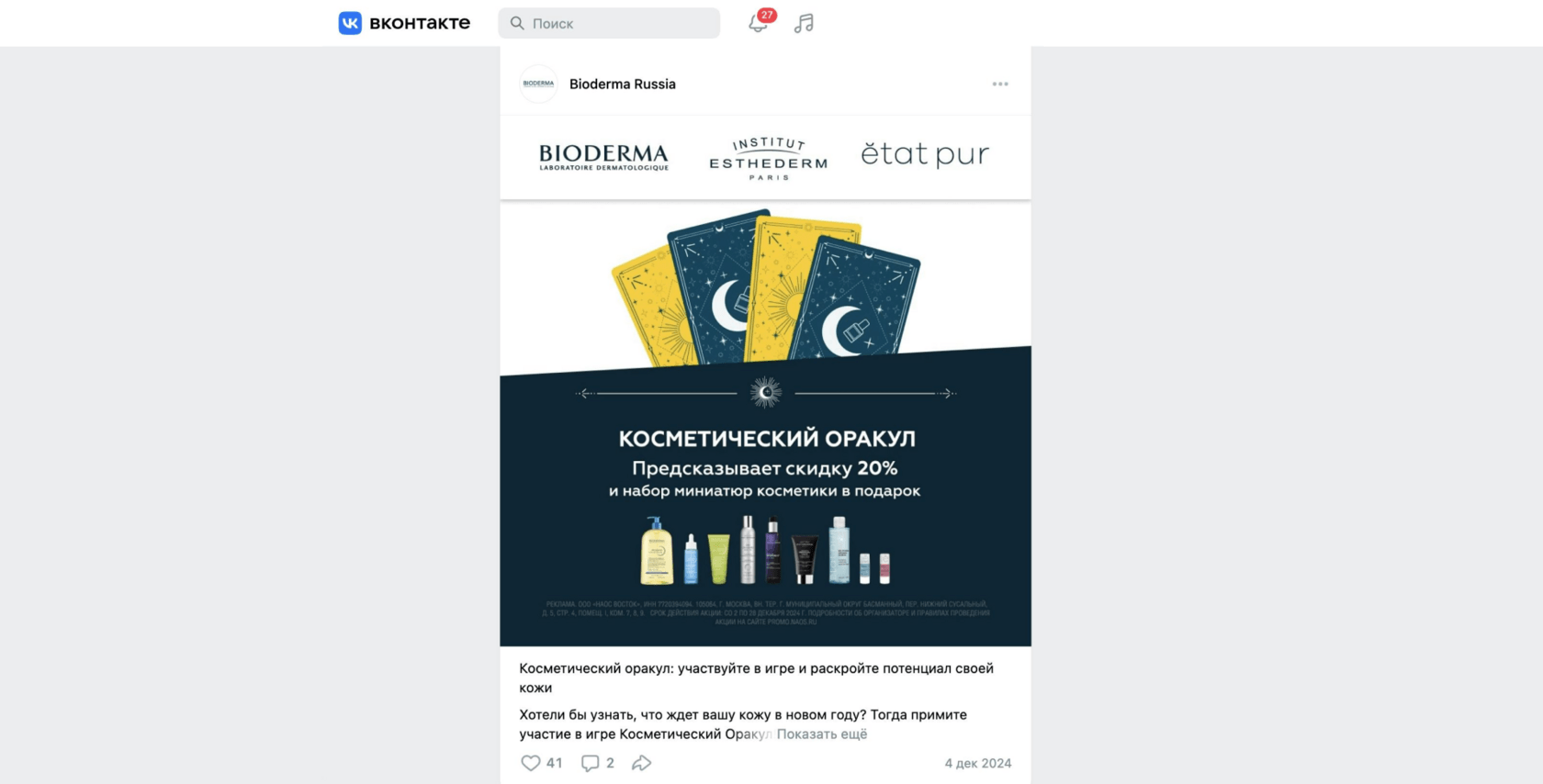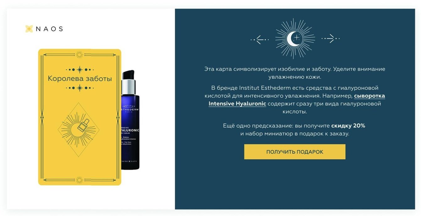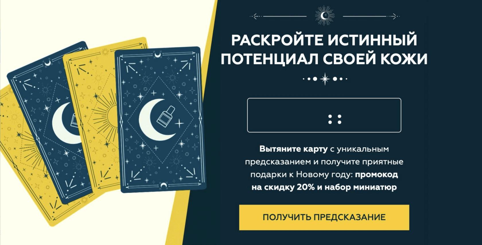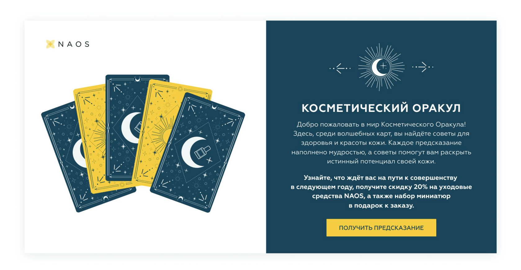 «Косметический оракул» — спецпроект, который не требовал сложной разработки и долгой подготовки. Идея использовать расклад Таро в контексте косметики — это креатив, который выделил игру среди однотипных новогодних акций.