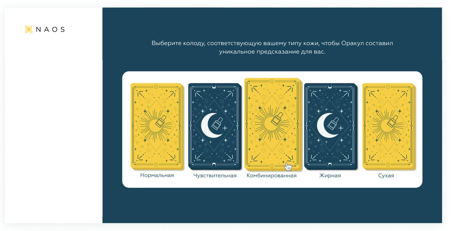 Механика простая: выбрать карту по типу кожи, затем выбрать карту-предсказание от косметического оракула.