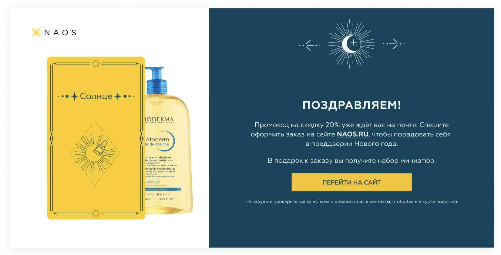 После прохождения игры пользователю предлагали оставить контакты, чтобы получить специальный приз — промокод на скидку 20% и набор миниатюр косметики. Настроили два автоматических сообщения: «Получение приза» и «Напоминание», — чтобы сократить путь пользователя до покупки.
