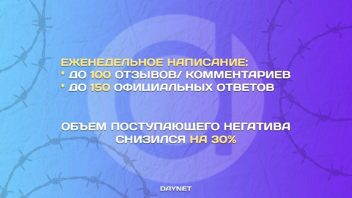 Перекрыли/сместили, частично вытеснили негатив. С помощью лидеров мнений и ответов от официального представителя обрабатывалось от 20 до 50 отзывов/комментариев в неделю.