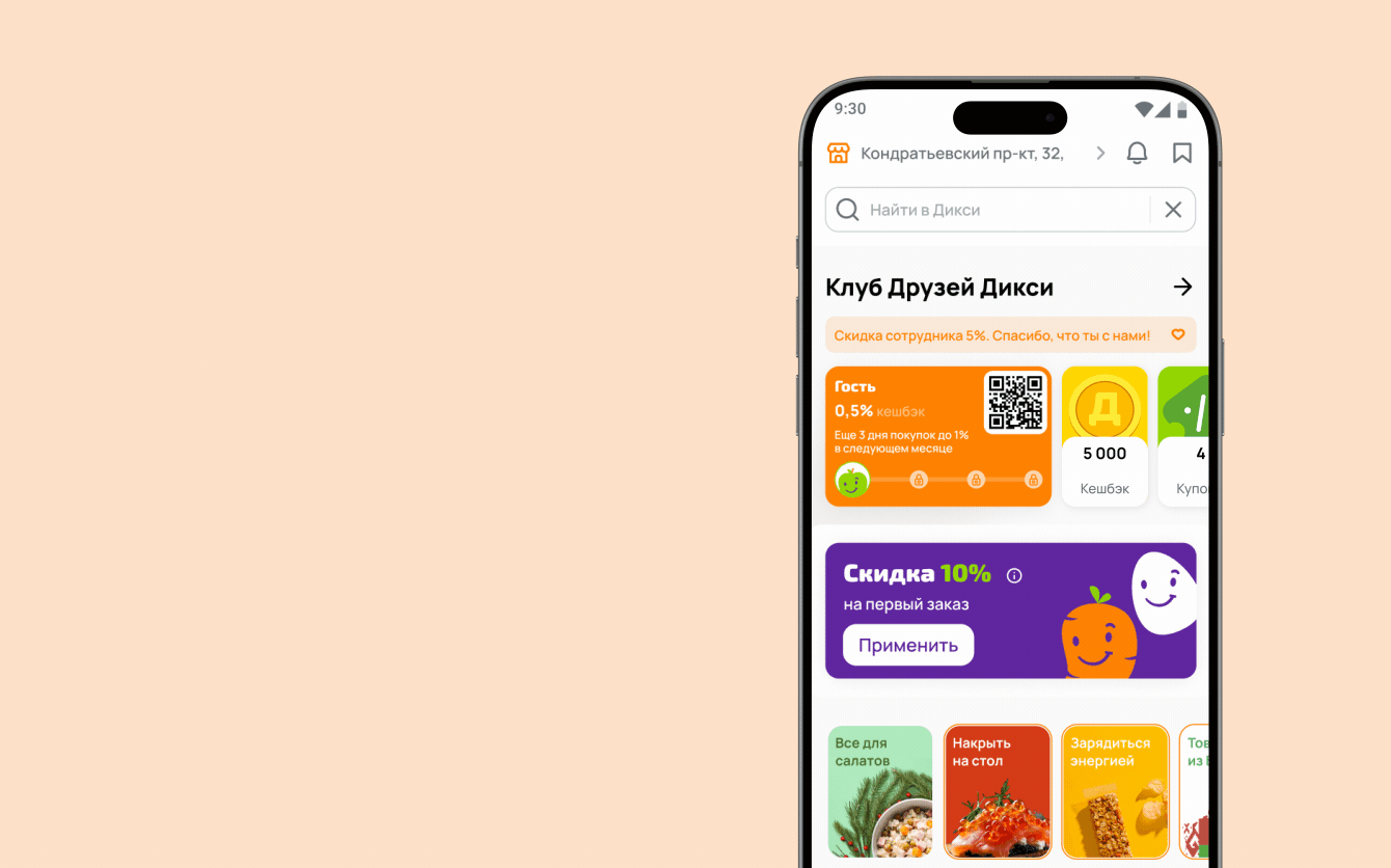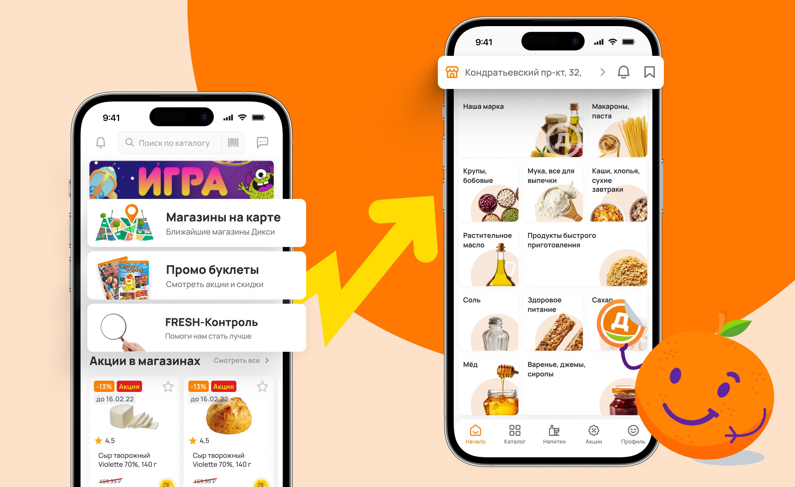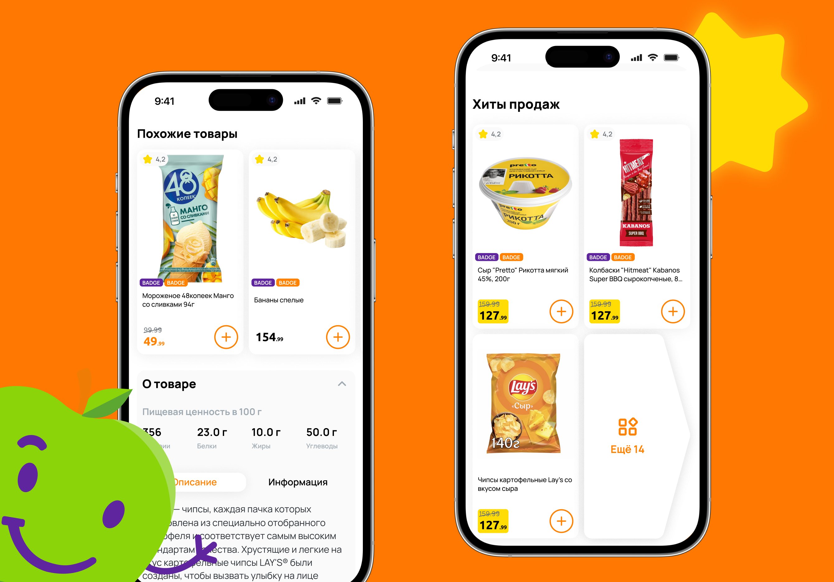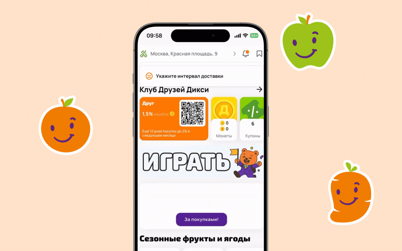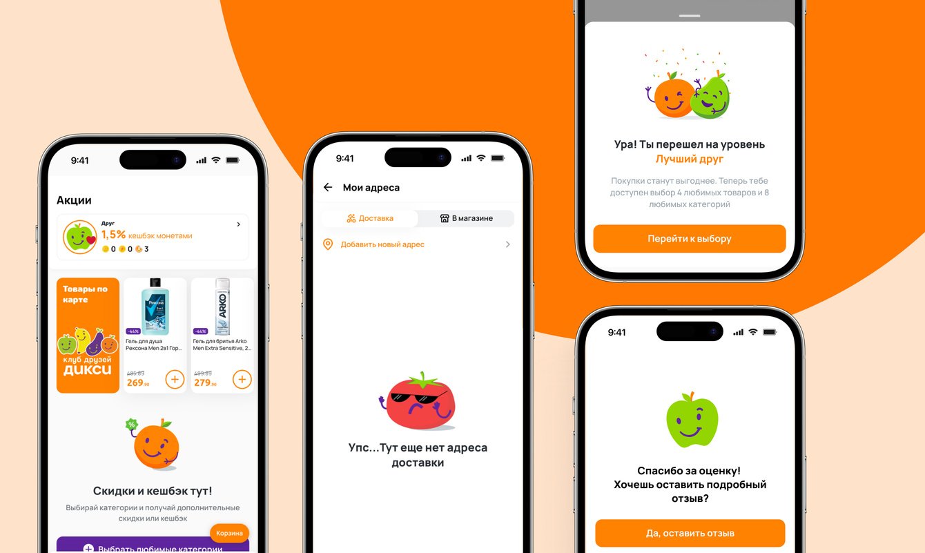 В приложении «Дикси» появились маскоты — веселые овощи на экране запуска и на обучающих экранах. Благодаря им интерфейс стал дружелюбнее.