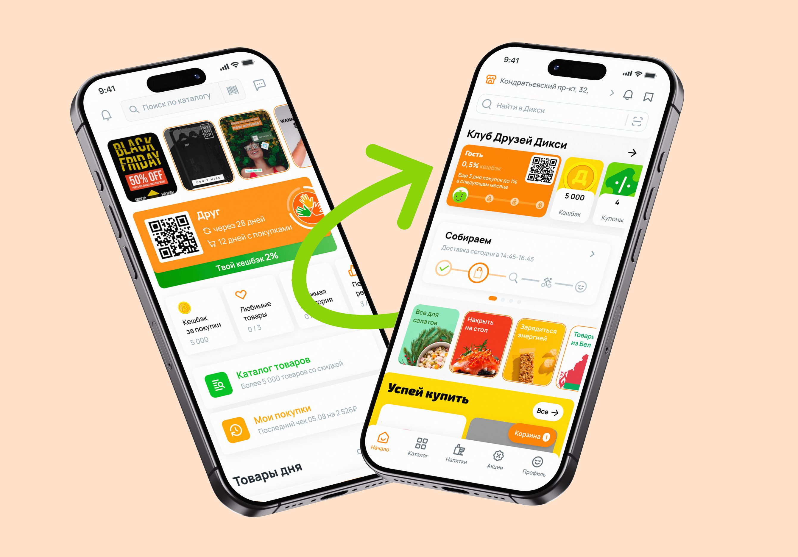 Поводом для редизайна мобильного приложения сети «Дикси» стало обновление брендбука: в айдентике появились новые фирменные цвета, закругленные элементы, маскоты-овощи и фирменный шрифт.