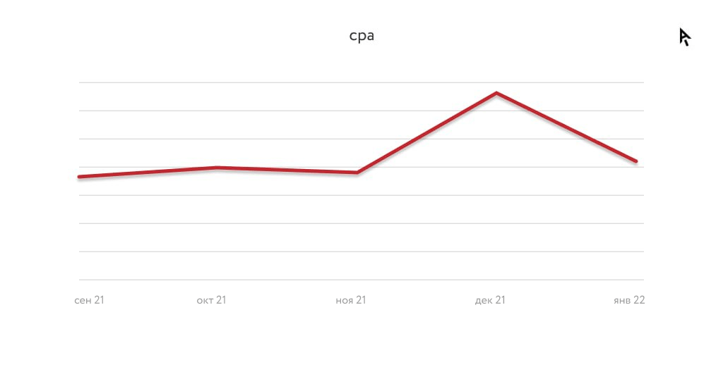 Пик стоимости заявки пришелся на декабрь 2021 года — к концу января 2022 года нам удалось снизить CPA на 56% и практически вернуть стоимость заявки к изначальной сумме.