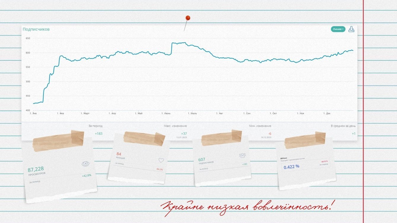 В Telegram количество аудитории — 607 подписчиков, всего за год на постах было получено 84 реакции, вовлеченность также низкая.