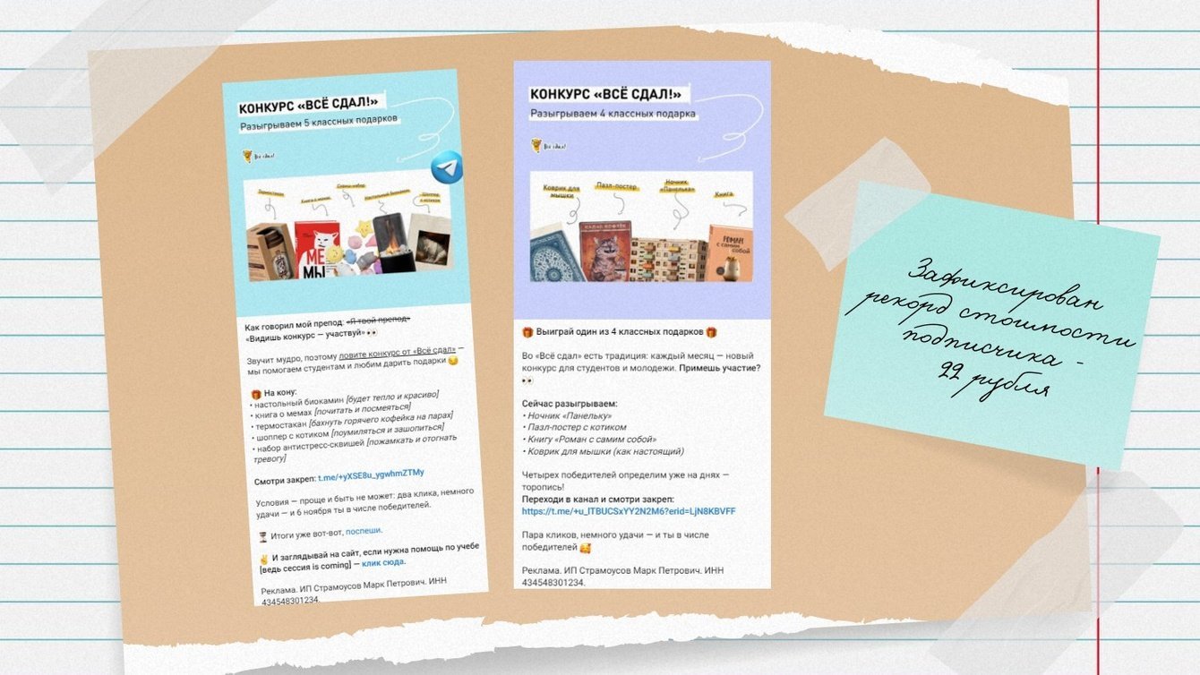В Telegram ежемесячно размещали информацию о конкурсах в различных каналах, где сидит молодежь. Тестировали разные тематики: развлечение и юмор, образование, саморазвитие, книги, аниме, новости блогосферы.