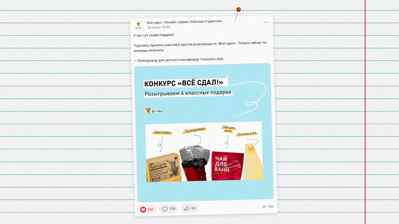 В качестве призов, как правило, выбираем недорогие, но интересные товары с маркетплейсов, которые бы могли заинтересовать молодежь. Например, разыгрывали: наборы азиатских снеков, картины по номерам, книги, настолки, оригинальный декор, технику и многое другое. Ежемесячно собирали более сотни участников при среднем призовом фонде до 4 тысяч рублей.