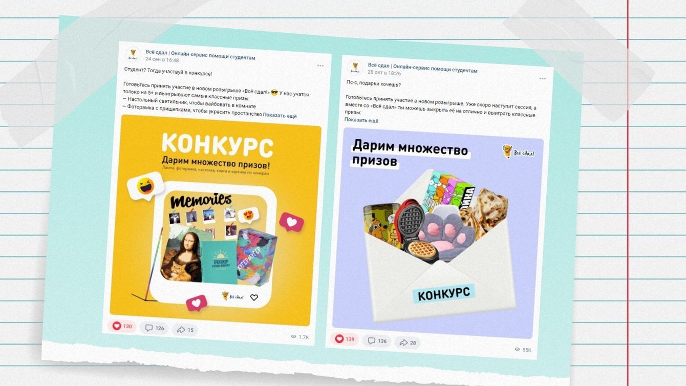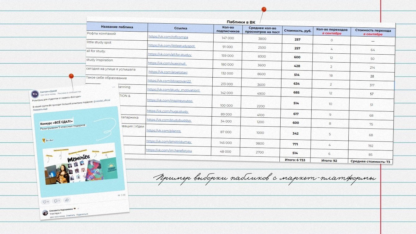 Также протестировали посевы на маркет-платформе в тематических пабликах, в качестве оффера был розыгрыш призов.
