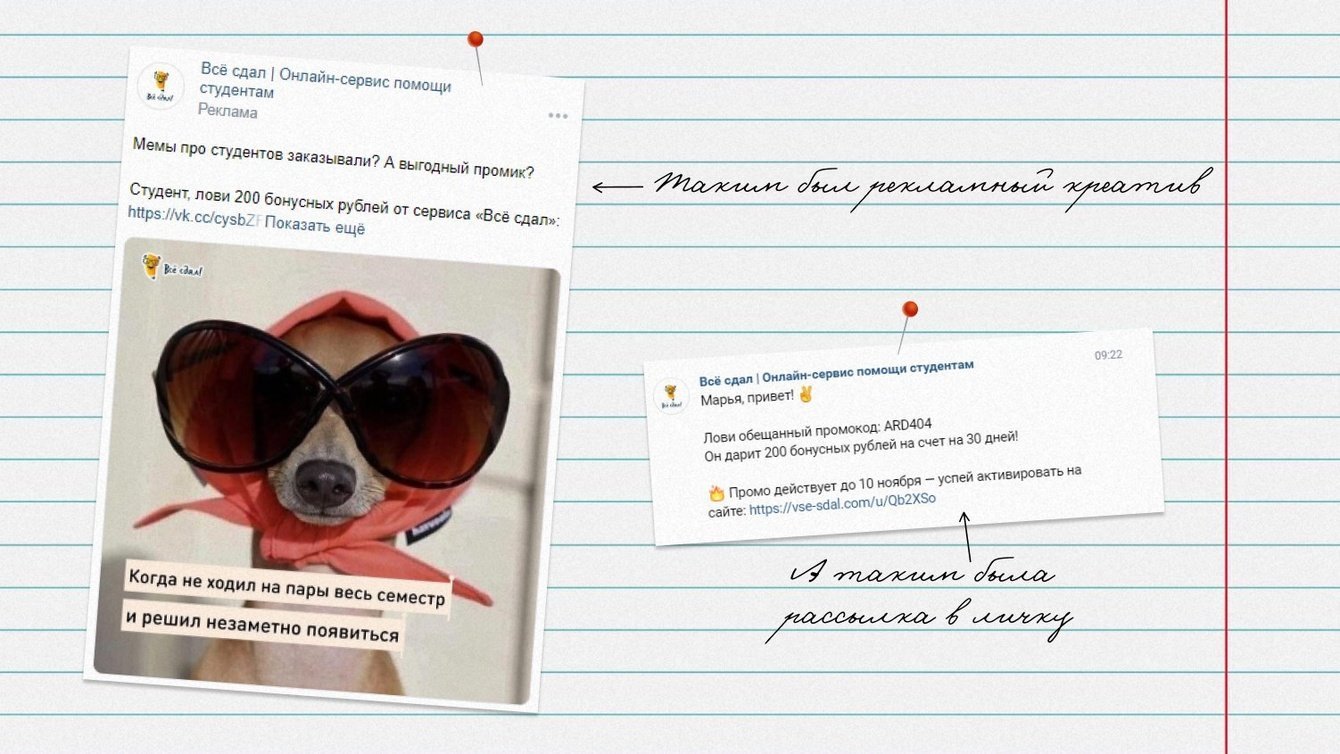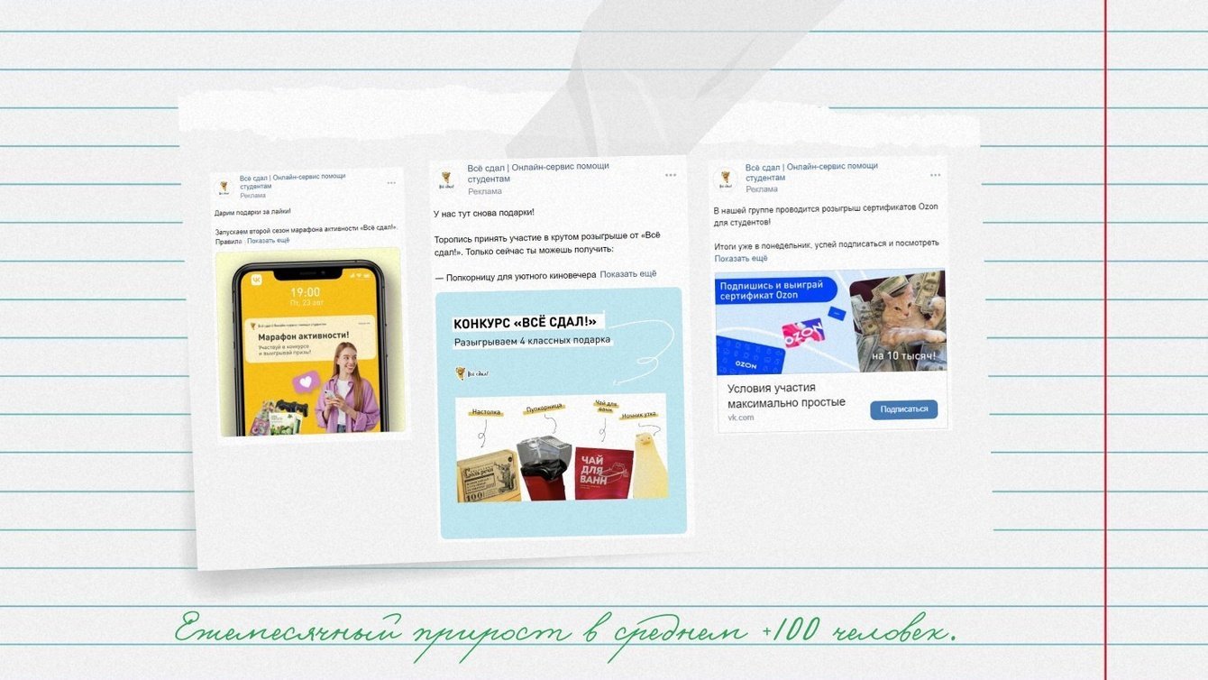 Также отдельно мы закрепили виджет в ВК с выдачей промокода за подписку — аудитория в него собиралась органически и с таргета в ВК.