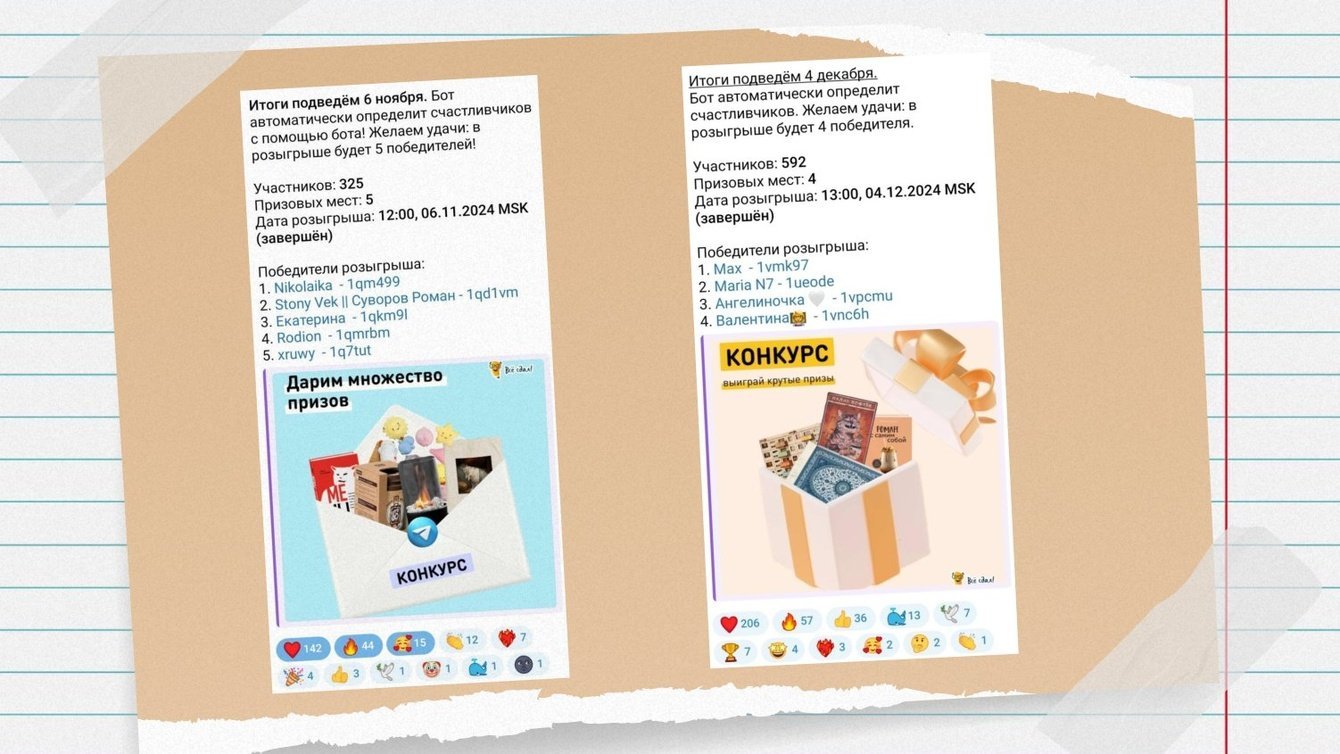 Любопытно, что конкретные товары с маркетплейсов в качестве призов сравнительно лучше заходят ЦА, чем сертификаты — это показал опыт первого и последующих розыгрышей. Также данная стратегия помогает минимизировать количество призоловов.