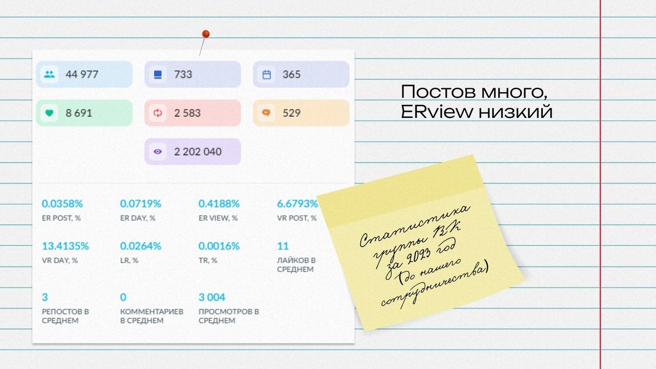 Во ВКонтакте собрана большая аудитория — около 44 тысяч подписчиков. За 2023 год в проекте публиковалось, в среднем, по 60 постов в месяц, показатель вовлеченности был низким: ERview — 0,4%.