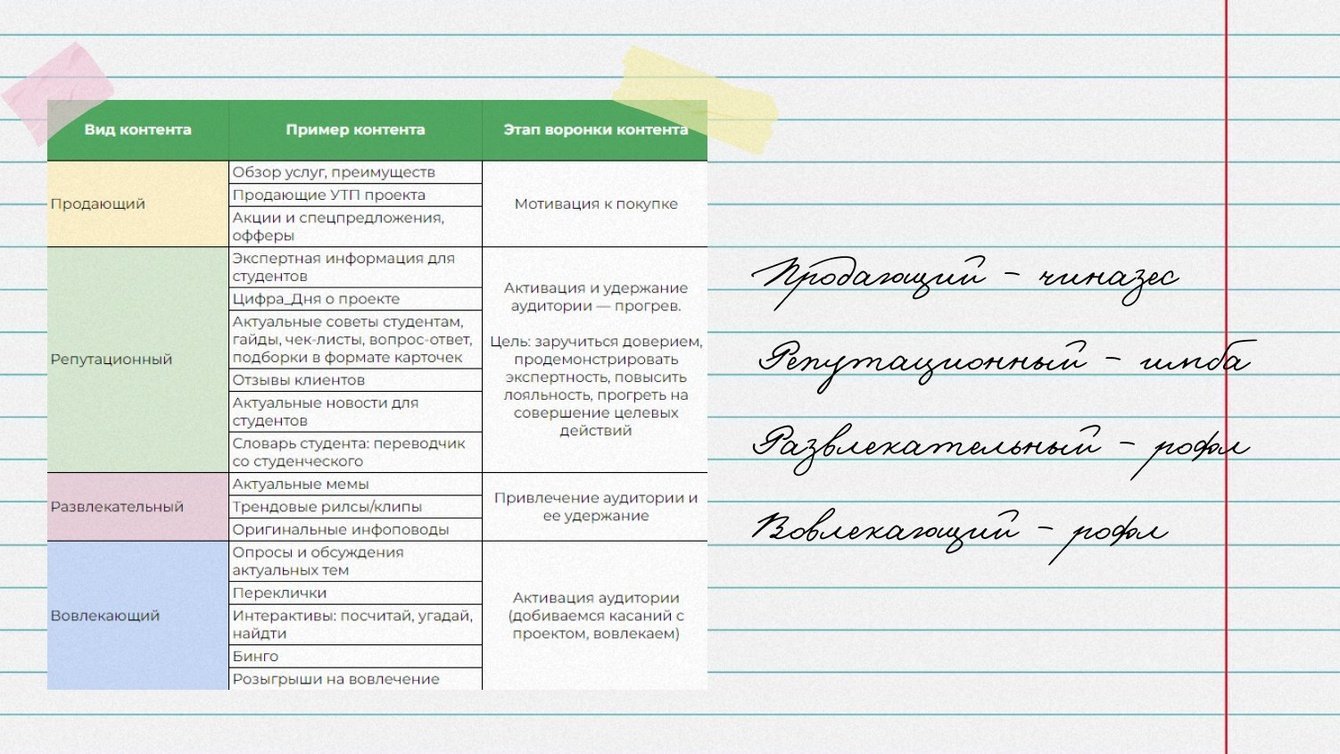 Прописали рубрикатор с основными видами контента: продающими, репутационными, развлекательными и вовлекающими постами. Каждый вид контента отвечает за свой этап воронки: привлечение аудитории, ее активация и удержание, стимулирование желания заказать услуги.