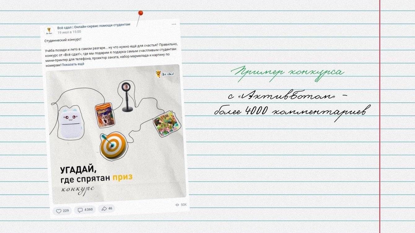 Также для увеличения активности и количества касаний с проектом мы использовали игры через сервис «АктивБот», благодаря которому собирали тысячи комментариев.