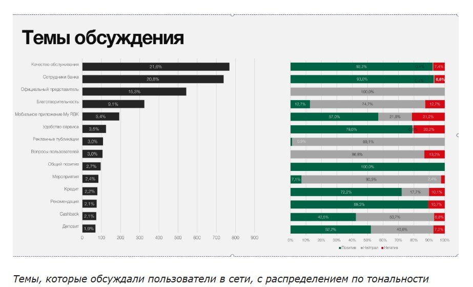 ● Выявляли инсайты. По результатам мониторинга можно понять, какие темы обсуждаются активнее, что в работе банка нравится клиентам, а над чем стоит поработать. Например, в случае Bank RBK сотрудников и качество обслуживания оценивали позитивно, работу официальных представителей нейтрально, а больше всего негатива было связано с удобством сервиса и мобильным приложением. На основе этих данных можно определить вектор изменений и начать вносить улучшения.