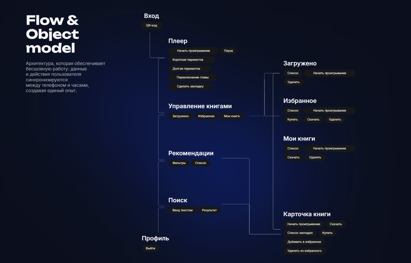 В финальную версию функционала вошли шесть блоков: управление книгами (каталог), плеер, текстовый поиск по каталогу, раздел рекомендаций, карточка книги с возможностью покупки прямо из приложения и авторизация по QR-коду из основного приложения Литрес. Удалось выполнить и обязательное требование заказчика: приложение работает без смартфона и без сети.