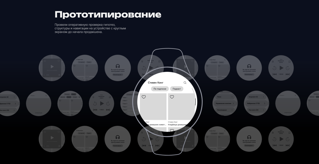 Другой проблемой стала адаптация управления аудиокнигой во время активности под форму экрана часов. Обширный функционал приложения должен оставаться максимально простым и быстрым, как на смартфоне, но без необходимости всматриваться в маленький экран.