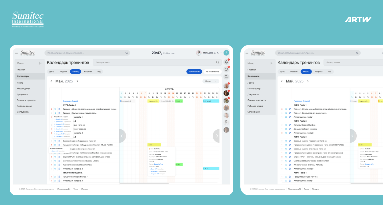 Мы работали над модулем «Личный кабинет», чтобы управлять обучением и развитием персонала, а также провели анализ задач и особенностей разных категорий сотрудников: механики, электрики, менеджеры и др.