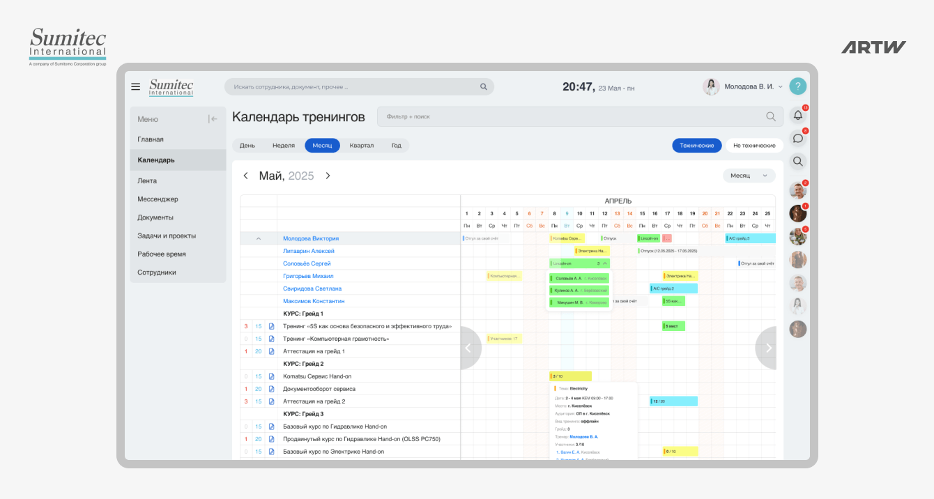 Ключевым элементом, который мы внедрили в процессы, стал кастомный модуль – календарь тренингов. Модуль отображает даты проведения тренингов и формирует списки сотрудников, участвующих в каждом из них. Благодаря календарю сотрудники и руководители получили удобный инструмент для планирования и контроля обучения.