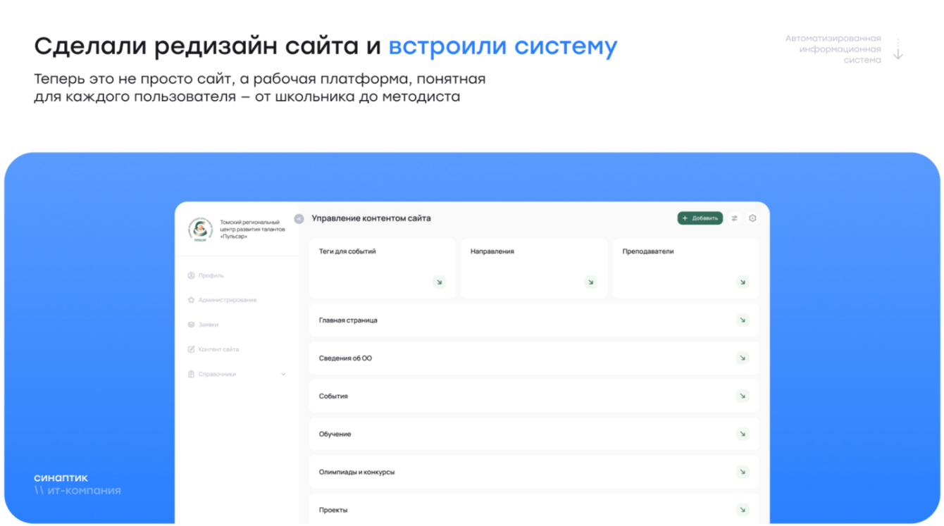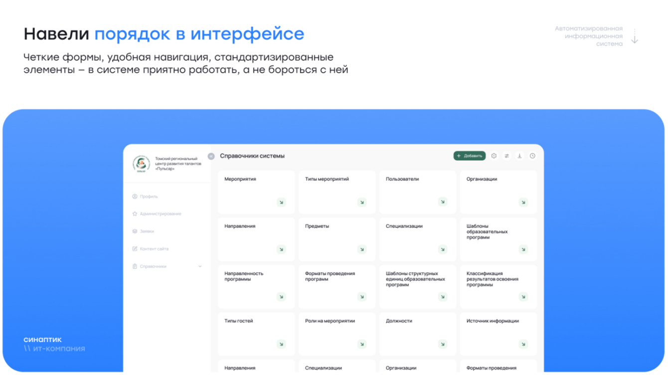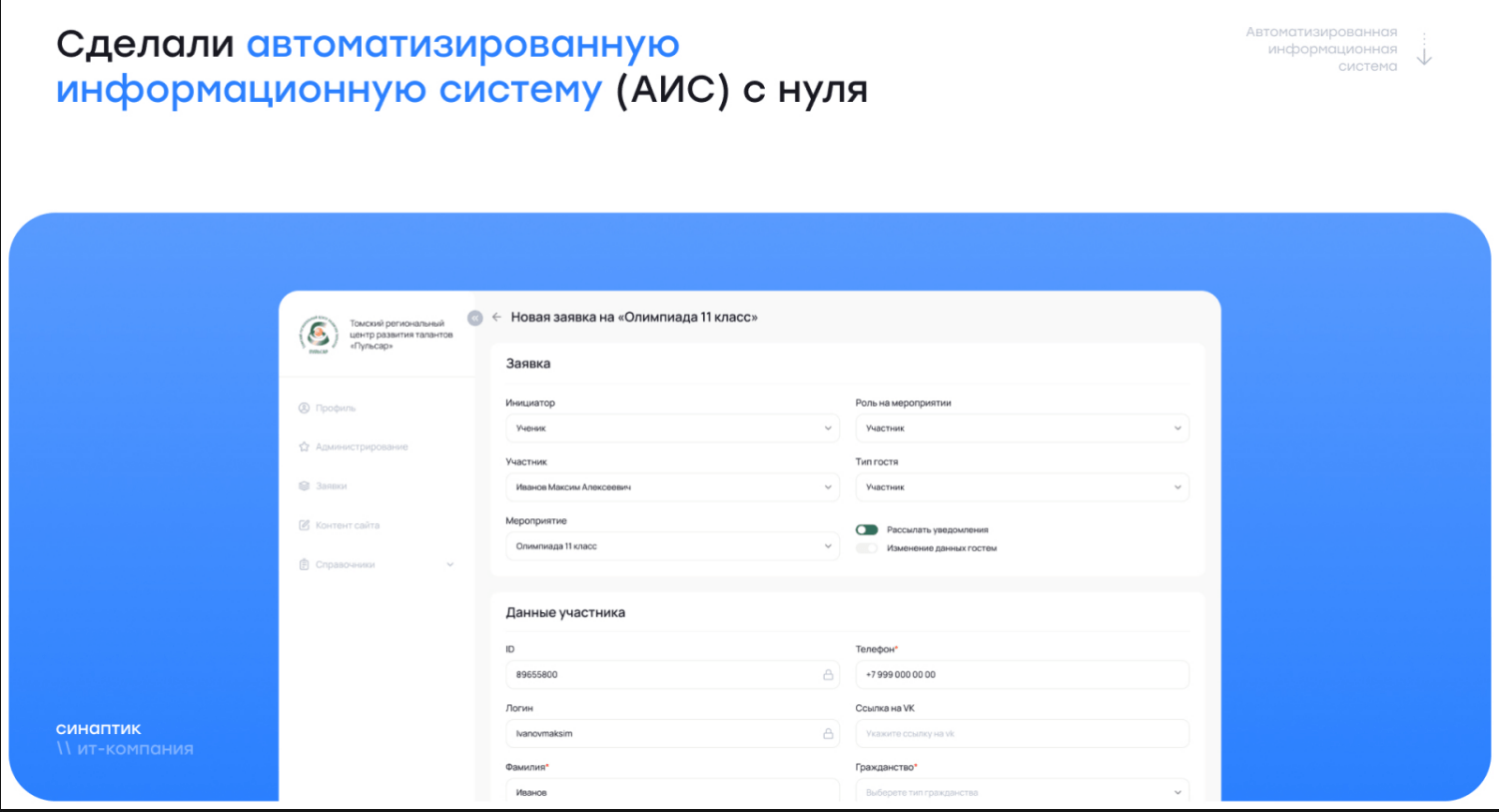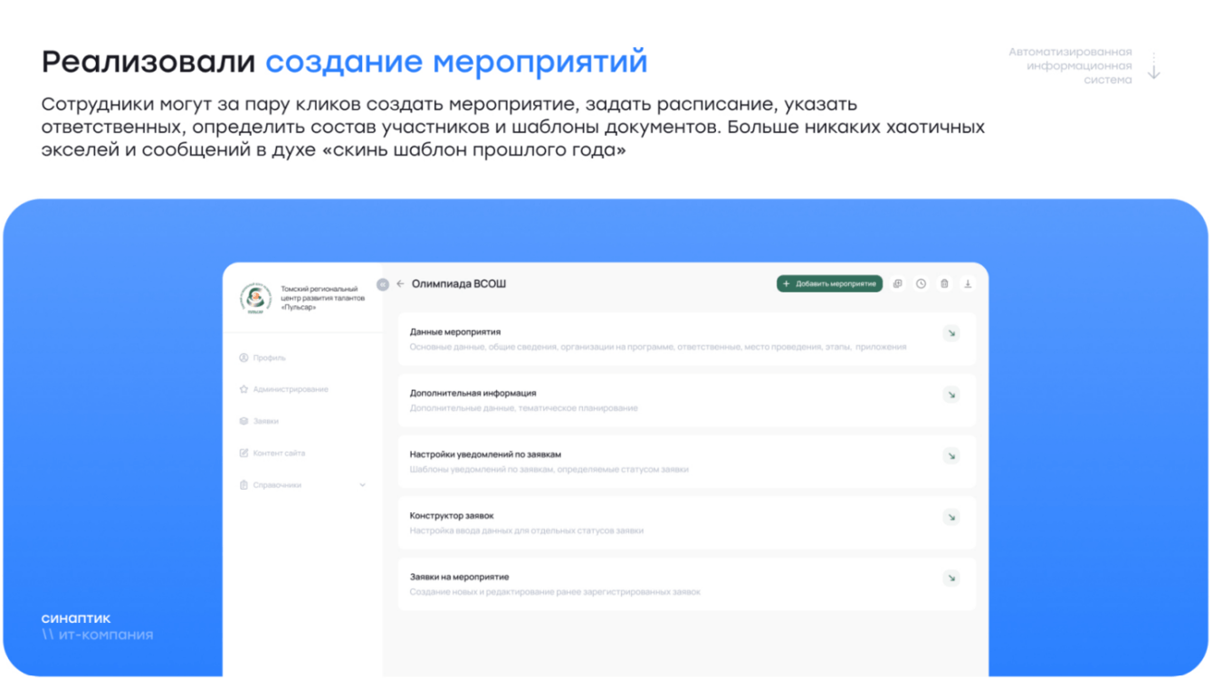 Создать автоматизированную информационную систему (АИС), которая позволит управлять всеми аспектами организации мероприятий: от подачи заявок и обработки документации до мониторинга и оперативного управления конкурсами и образовательными программами.