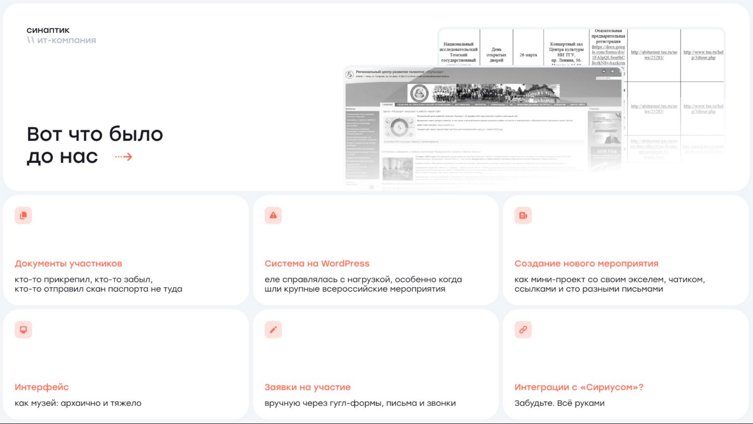 - Много однотипных задач и бумажной работы: Текущая система на базе WordPress не поддерживала автоматизацию. Всё приходилось делать вручную - это занимало много времени и увеличивало количество ошибок.
