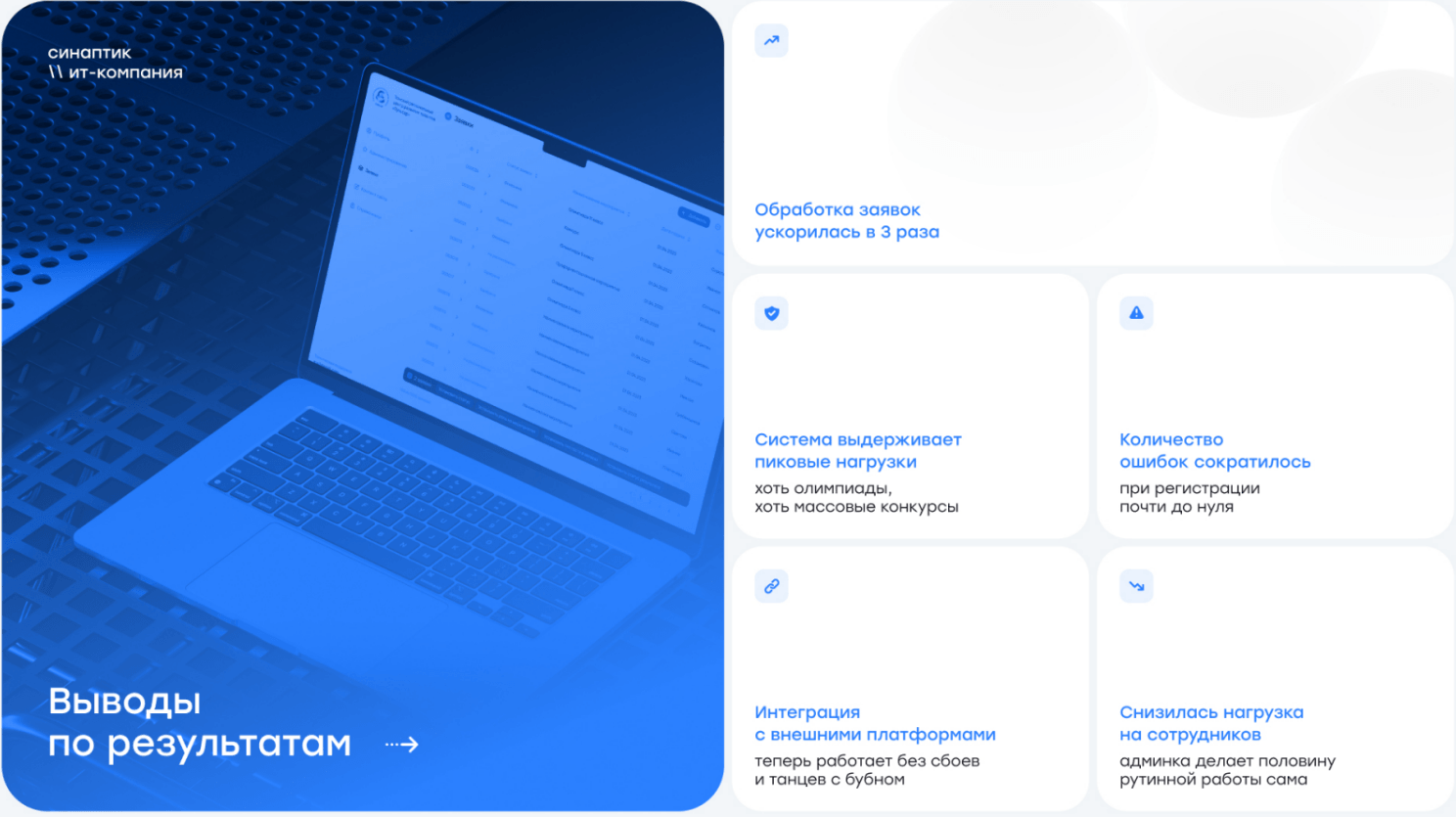 Новая система автоматизировала ключевые процессы подачи заявок и обработки документов, что сократило затраты времени сотрудников на 18% и позволило сэкономить до 16% ресурсов, ранее затрачиваемых на административные задачи. Более 50 сотрудников прошли обучение и сразу начали работать с новой системой. Удовлетворенность пользователей увеличилась на 37%, а количество обращений в техподдержку снизилось вдвое.