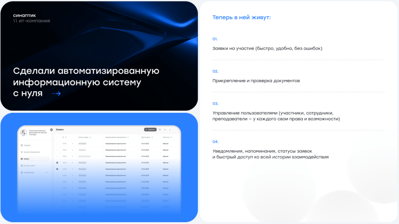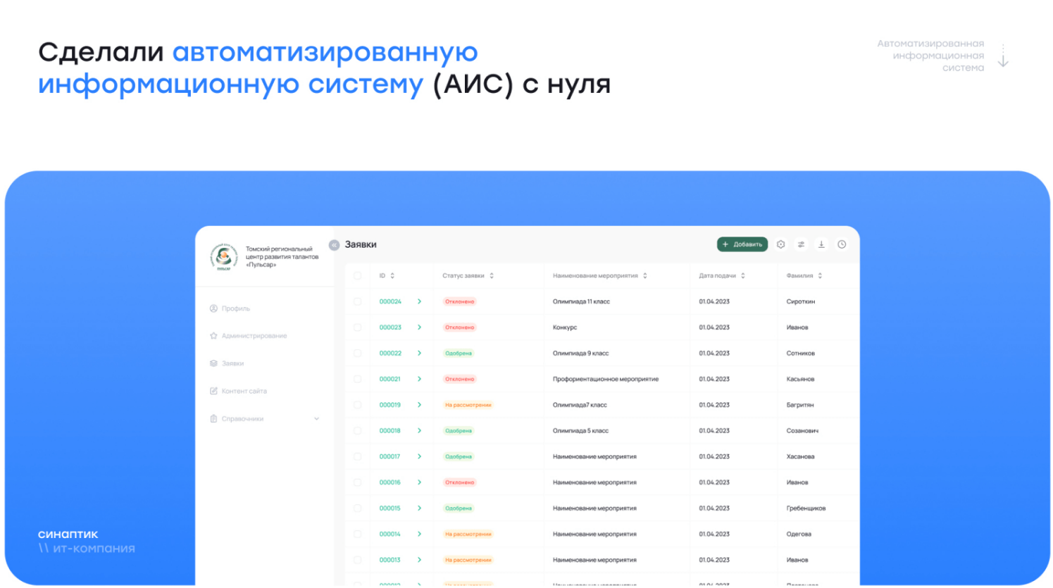 Интеграция и автоматизация: Разработали АИС с возможностью подачи заявок через сайт, автоматической обработкой документов и интеграцией с внешними системами.